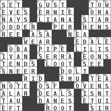 ACROSS 1. Arrange properly for use 4. Abrupt rush of wind 8. Pull behind 11. Nights before holidays 13. Bert's buddy 15. Mouth or opening 16. Negative votes 17. Climbing, woody, usually tropical vines 18. Play the lead 19. More peculiar 21. For each 22. Coop moms 23. To sift 24. White ___ sheet 27. Teachers' org. 29. Put on (as clothing) 30. Peak District village in England 34. Chief or king in Benin or Nigeria 36. Corncob 39. Ms. Damita and namesakes 40. _ the terrible 41. Spanish missionary in California 43. Immeasurably long periods of time 44. Looks after 46. Spoils 47. Perceive with the eye 48. Contemptuous expression 49. Dunce 51. To free from 53. Australian flightless bird 54. Afternoon social gathering 57. Make mention of 60. Order of Saint Francis (abbr.) 63. Baking chambers 65. Having or resembling wings 66. Allots cards 69. Is not 70. The 19th letter of the Greek alphabet 71. Natives or inhabitants of Denmark 72. Needle case 73. Newt 74. Carrot, for example 75. Title for a knight DOWN 1. Sir (Sp.) 2. Dodge 3. Miss Universe 1986, Barbara Palacios _ 4. Set 5. RI univ. 6. Fastener 7. Prong on a fork 8. Lug 9. NW Algerian seaport 10. Armed conflicts 12. Compass dir. 14. Merit 18. Most dubious of character or honesty 20. Actress Charlotte 25. Plant excrements 26. Satellite of Uranus 28. Snakelike fish 29. Nomad 31. Medicinal plant 32. Actor's bit 33. Curvy letter 34. Baking chamber 35. Object of repulsion 37. Adept person 38. Wear away 40. It is 42. Smallest unit of an element 45. _ Lanka 50. Nilotic language 52. Texas town _ City 54. Trials 55. World-weariness 56. Being in motion 57. Nathan's nickname 58. Norwegian king 59. Pulled tight 61. Shrivel 62. Papal veil 64. Compete 67. Lion 68. Fast jet (abbr.)