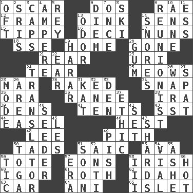 ACROSS 1. Motion picture award 6. Two (Sp.) 9. Actress Charlotte 12. Movie unit 13. Pig sound 14. Elected reps. 15. Likely to tip or tilt 16. Tenth: prefix 17. Religious women 18. Compass dir. 19. Dwelling 20. Went 21. Posterior 23. RI univ. 24. Pull apart 25. Catcalls? 28. Make imperfect 30. Swept the length of 34. Fastener 35. Mouth or opening 36. The wife of a rajah (variant) 38. Lyricist Gershwin 39. Habitations of wild animals 41. Portable shelters 43. Fast jet (abbr.) 44. Artist's stand 46. Command 48. Area sheltered from the wind 49. Essential or central part 50. Small amounts or degrees 51. Ketch in the Levant 53. Actress Gardner 56. Carry 57. Immeasurably long periods of time 58. From or relating to Ireland 60. Russian composer Stravinsky 61. Writer of Portnoy's Complaint (1969) 62. Potato state 63. 4-wheeled motor vehicle 64. Black tropical American cuckoo 65. Small island DOWN 1. Often (poetically) 2. Indian titles of respect 3. Smile enhancers 4. Electrical Unit 5. Marina Del _, California 6. South Vietnam president (1954) 7. Single time 8. What Jean-Claude Killy likes to do 9. One who advocates reunion 10. Queen of England 1702-14 11. Curvy letter 13. Scent 14. Sounds asleep 19. Ethiopian city, capital of Harari 20. Chewing product 22. Hearing organ 24. Interpreter 26. Armed conflicts 27. Argument over a trivial matter 28. Method 29. Length times width 31. Krazy ___ of comics 32. Compass dir. 33. Lair 37. Value system 40. Sowing specialist 42. Arrange properly for use 45. French article 47. Pottery fragments 49. Expression of disdain 50. Ancient Roman robe 51. Within a short period 52. Against 54. Small bottle 55. American tennis player Robert 56. Nervous spasm 57. Epoch 58. One more than two 59. Being at a high temperature