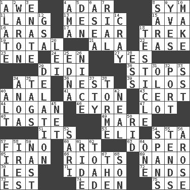 ACROSS 1. Deep reverence 4. The sixth month of the Jewish calendar 8. Symbol (abbr.) 11. Long (Scottish) 13. Of or pertaining to a meson 15. Actress Gardner 16. Ancient river in northeast Turkey 17. Approach 18. Long journey 19. Add up to 21. In the manner of 22. Relaxation 23. Compass dir. 24. Car or cant ending 27. Affirmative reply 29. "You Light Up My Life" star Conn 30. Closes up, plugs up 34. Had dinner 36. Egg locale 39. Grain storage towers 40. Of or related to the anus 41. NE Massachussets city 43. An absolute certainty 44. Utah city north of Ogden 46. Jane of fiction 47. Car dealer's back yard 48. Clothes sense 49. Female horse 51. It is 53. Connecticut Ivy Leaguer 54. R.R. building 57. Fine (Spanish) 60. Tate display 63. Drug addict 65. SW Asia republic 66. Debaucheries 69. Billionth: prefix 70. French article 71. Potato state 72. Conclusions 73. Eastern Standard Time (abbr.) 74. Genesis locale 75. Compass dir. DOWN 1. Having winglike extensions 2. Make _____ (do battle with) 3. Related on the mother's side 4. Housemaid (var.) 5. Lair 6. At sea 7. Monetary unit of Yemen 8. "Two Mules for Sister ____" 9. Jacques Cousteau's middle name 10. Cause to be 12. Girls' org. (abbr.) 14. Supercomputer manufacturer 18. One of the two male reproductive glands 20. Luau accessory 25. Pulitzer Prize-winning author Ferber 26. Sibling's daughter 28. Curvy letter 29. Accusation by an informer 31. Margarine 32. Left side of a ship or aircraft 33. Fast jet (abbr.) 34. Small Philippine buffalo 35. Labels 37. Filthy place 38. Singer Mel 40. The first octave above the treble staff 42. Anneal 45. Remaining after all deductions 50. To free from 52. Indian skirt 54. Connects, as a bridge 55. Is inclined (to) 56. Came up 57. Do some clerical work 58. Angers 59. Political cartoonist Thomas 61. Travel on an animal 62. Frog relative 64. Single 67. Definite Article 68. Male offspring