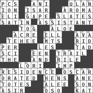ACROSS 1. Personal Computers (abbr.) 4. Cuckoo 7. ____ Bator 11. Electrically charged atom 12. Austrian river, tributary to the Danube 13. Odor 14. Biblical high priest 15. Yawn 16. Chalkboards 17. Smooth fabric 19. Helper 21. Coat; cloak 23. _ vera 24. 1/640 square mile 25. Pipe bend 26. Actress Gardner 29. Giggle 30. Mountains (abbr.) 31. To free from 32. For each 33. French article 34. Bit 35. _-fi 36. Car or cant ending 37. Get behind 40. Definite Article 41. Plus 42. Cause heat under the collar 43. Australian parrot (variant) 45. Naughty child 46. Home 51. Motion picture award 55. Declaimed 56. Coop moms 58. One (Scot) 59. Hauls 60. Toward shelter 61. Male offspring 62. SW Saudi Arabia district 63. Bear (Spanish) 64. Krazy ___ of comics DOWN 1. Sliced desserts 2. Root beer relative 3. In a ____ (agitated or irritated) 4. White ___ sheet 5. California wine valley 6. Angers 7. A salt of uric acid 8. Globular water bottle used in Asia 9. So be it 10. Political cartoonist Thomas 12. Refuse to acknowledge 13. In addition 16. Beverly of Met fame 18. Hankering 20. Table seasonings 22. Unit of force equal to gravity 24. Nest on high 25. Make improvements or corrections to 26. Nick name for Arthur 27. Small bottle 28. Say or write further 29. Technology 32. Pacific Standard Time (abbr.) 33. Soviet premier 1918-24 36. Having ears or earlike features 37. Three (prefix) 38. Full of chinks, cracks, or crevices 39. High mountains 43. 61 cubic inches 44. Lyric poems 46. Round or rotation of duties 47. Greek god of love 48. Suttee (variant) 49. US Secretary of Labor Elaine L. _ 50. Snakelike fish 52. Keg 53. Small Philippine buffalo 54. Monthly bill 57. Modern: prefix
