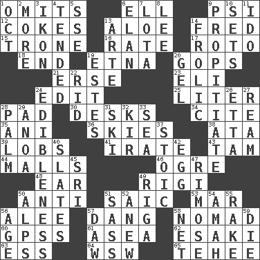 ACROSS 1. Leaves out 6. Pipe bend 9. Air pressure measure (abbr.) 12. Popular sodas 13. Medicinal plant 14. Flintstone 15. Heavy duty weighing machine 16. Pace 17. Printing process, for short 18. Conclude 19. Inactive volcano in Sicily 20. Republicans 21. Celtic language 23. Connecticut Ivy Leaguer 24. Prepare for publication 25. 61 cubic inches 28. Writing tablet 30. Writing tables 34. Quote 35. Black tropical American cuckoo 36. Atmospheres 38. "One Day ___ Time" 39. Tennis shots 41. Feeling or showing extreme anger 43. Scottish cap 44. Shopping centers 46. Legendary monster 48. Hearing organ 49. Swiss mountan, "Queen of the Mountains" 50. Against 51. Ketch in the Levant 53. Impair 56. Toward shelter 57. Mild oath, euphamism for damn 58. Wanderer 60. Global Positioning Systems (abbr.) 61. Toward the sea 62. 1973 Nobel Price Winner (Physics) Leo 63. Double-curved letter 64. Compass dir. 65. Giggle DOWN 1. Sep. follower 2. Greater amount 3. Visual representation of an object 4. Looked after 5. Compass dir. 6. Enthusiasm 7. Globular water bottle used in Asia 8. Area sheltered from the wind 9. Appease 10. Puts into a specified state 11. Wedding promise 13. Johnson of "Laugh-In" 14. Romp 19. _____ Park, CO 20. Set 22. To free from 24. The property of being fit to eat 26. Singer James 27. 480, 500 or 516 sheets of paper 28. Inside of hand 29. Small Philippine buffalo 31. What Jean-Claude Killy likes to do 32. Apertif with cassis 33. Ocean 37. Unemotional 40. Chalkboards 42. Oval reproductive body of a fowl 45. _ Lanka 47. Full of chinks, cracks, or crevices 49. Port city in Latvia 50. High mountains 51. Backtalk 52. Afresh 54. Nanny 55. Libertine 56. Ripen 57. Obsolete 58. Fish or hair follower 59. Expire