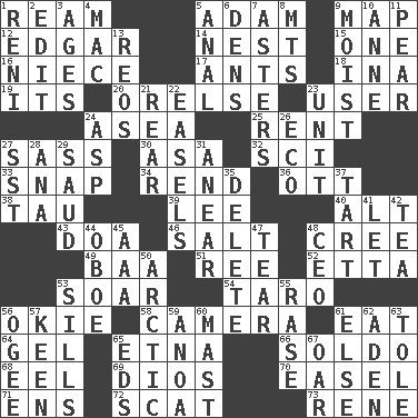 ACROSS 1. 480, 500 or 516 sheets of paper 5. First man 9. Atlas unit 12. _ Allan Poe 14. A home for chicks 15. Single 16. Sibling's daughter 17. Pismires 18. _ tizzy (2 wds.) 19. ___ a Wonderful Life 20. Threatening words 23. One who uses or employs something 24. Toward the sea 25. Monthly bill 27. Backtalk 30. White ___ sheet 32. _-fi 33. Fastener 34. Tear apart 36. Baseball player Mel 38. The 19th letter of the Greek alphabet 39. Area sheltered from the wind 40. The first octave above the treble staff 43. ___ good deed 46. Table seasoning 48. Algonquian 49. Sound made by sheep 51. To riddle 52. Singer James 53. Fly high 54. Pacific island yam 56. Migrant worker of the '30s 58. Device for capturing images 61. Ingest 64. Set 65. Inactive volcano in Sicily 66. Twentieth part of a lira 68. Snakelike fish 69. "Vaya con ____" 70. Artist's stand 71. Followers of ems 72. Go away! 73. French philosopher Descartes DOWN 1. Painter Guido (1575-1642) 2. Prepare for publication 3. Eras 4. Big _ 5. Of or related to the anus 6. Cub Scout units 7. Michaelmas daisies 8. Mountains (abbr.) 9. Wet 10. Singer Murray 11. Lightbulb-shaped fruit 13. Vintage cars 21. Tail end 22. Artist's stands 23. A single undivided whole 24. Cleo's killer 26. Environmental prefix 27. Fast jet (abbr.) 28. Santa ___, CA 29. Saudi Arabian king (1953-1964) 31. Approach 35. Erase 37. Small pie 41. Allow 42. Beverage made from leaves 44. Mitch Miller's instrument 45. American Automobile Association (abbr.) 47. Separate forcefully 48. Corporate head (abbr.) 50. Northern region 53. Beverly of Met fame 55. To erase 56. Double curve, resembling the letter S 57. Peachy ____! 59. Small Philippine buffalo 60. Vertical spar for supporting sails 61. Otherwise 62. Arabian gulf 63. Lacquered or enameled metalware 65. Begley and Asner 67. Rowing implement