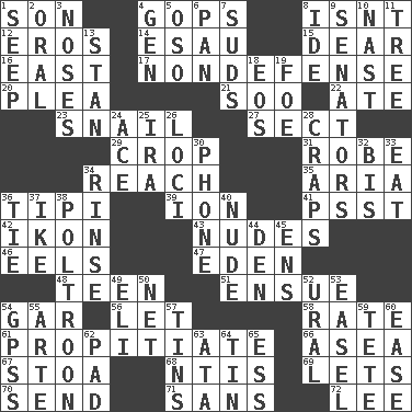 ACROSS 1. Male child 4. Republicans 8. Is not 12. Greek god of love 14. He sold his birthright 15. Letter starter 16. 90 degrees 17. Unrelated to defense, as in spending 20. Entreaty 21. "Barney Miller" actor Jack 22. Had dinner 23. Slow-paced one 27. Religious group 29. Riding implement 31. Loose flowing garment 34. Arrive at 35. Operatic vocal solo 36. Native american tent (variation) 39. Electrically charged atom 41. Inconspicuous attention getter 42. Visual representation of an object 43. Unadorned figures 46. Snakelike fish 47. Locale of original sin 48. Adolescent 51. Follow as a consequence or result 54. Slender fish 56. Allow 58. Pace 61. Appease 66. Toward the sea 67. Portico 68. Nuclear Threat Initiatives 69. Allows 70. Post 71. Without 72. Area sheltered from the wind DOWN 1. Ooze 2. Taken by mouth 3. Olfactory organs 4. Commissioned military rank (abbr.) 5. Bear (Spanish) 6. Baking dish 7. Soap bubbles 8. Binary compound 9. Legislators 10. Political cartoonist Thomas 11. Relationship diagram 13. Comedian Laurel of Laurel & Hardy 18. Greek goddess of the dawn 19. Enemy 24. Adept person 25. Retirement account (abbr.) 26. Locales 28. Dice game 30. Give a jingle 32. Again 33. Erode 34. Remove soap 36. Make a knot 37. Mamie's mate 38. Characterized by complete cowardliness 40. Unadorned 44. Lair 45. Followers of ems 49. Connecticut Ivy Leaguer 50. Remaining after all deductions 52. Mountain range 53. Artist's stand 54. Global Positioning Systems (abbr.) 55. Johnson of "Laugh-In" 57. Airtight sealed metal containers 59. False hair 60. Comfort 62. Writing tablet 63. "One Day ___ Time" 64. Metal container 65. Curvy letter