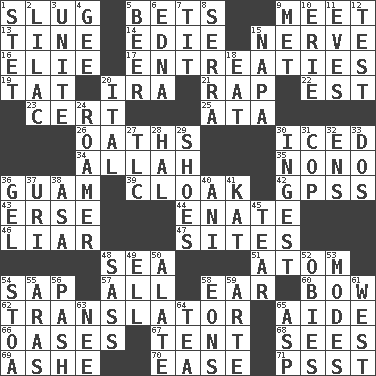 ACROSS 1. Strike heavily 5. Antes 9. Confront 13. Prong on a fork 14. Singer Brickell 15. Impudent aggressiveness 16. Writer Wiesel 17. Pleas 19. Make lace 20. Retirement account (abbr.) 21. Strike 22. Eastern Standard Time (abbr.) 23. Certainty 25. "One Day ___ Time" 26. Expletives 30. On the rocks 34. Assad's deity 35. Words to Nanette 36. Island territory of the United States 39. Anything that covers or conceals 42. Global Positioning Systems (abbr.) 43. Celtic language 44. Related on the mother's side 46. One who doesn't tell the truth 47. Settings 48. Ocean 51. Tiny particle 54. Plant excrement 57. Everything 58. Hearing organ 60. Ribbon knot 62. Interpreter 65. Assistant 66. Fertile tracts in a desert 67. Portable shelter 68. Perceives with the eye 69. American tennis player Robert 70. Comfort 71. Inconspicuous attention getter DOWN 1. Proofreading order 2. Pale purple color 3. Join together 4. Unit of force equal to gravity 5. Fermented drink made from hops 6. Pulitzer Prize-winning author Ferber 7. Teat (slang) 8. Spanish missionary in California 9. Was introduced to 10. One of the Great Lakes 11. Nights before holidays 12. Trial 15. California wine valley 18. Erode 20. Slanted text style (abbr.) 24. Wanderer 27. Affectionate concern, for short 28. Actor Linden 29. Imelda's hoard 30. Swallow 31. Police officer (slang) 32. Followers of ems 33. Two (Sp.) 36. Set 37. RI univ. 38. White ___ sheet 40. Cuckoo 41. Krazy ___ of comics 45. Separate forcefully 48. Backtalk 49. Pipe bend 50. Having winglike extensions 52. Off-Broadway awards 53. Methods 54. Portico 55. Caspian sea tributary 56. Romantic infatuation 58. Immeasurably long periods of time 59. Johnson of "Laugh-In" 61. 270 degrees 63. Born 64. Beverage made from leaves 65. Cleo's killer
