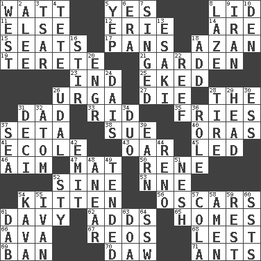 ACROSS 1. Electrical Unit 5. Consenting reply 8. Hat (slang) 11. Otherwise 12. 4th largest of the Great Lakes 14. "We ___ not amused" (Victoria) 15. Theater features 17. Baking dishes 18. Muslim summons to prayer 19. Cylindrical with tapered ends 21. Place where plants grow 23. Indiana (abbr.) 25. Made supply last 26. Capital and largest city of Mongolia 27. Pass on 28. Definite Article 31. June honoree 33. To free from 35. Strips of potato fried in deep fat 37. Bristle 38. Take to court 40. Mouths or openings 41. Learning spot: Fr. 43. Boat paddle 45. Directed 46. Direct toward a target or goal 47. Floor protector 50. French philosopher Descartes 52. Trig term 53. Compass dir. 54. Baby cat 56. Motion picture awards 61. _ Jones' Locker 62. Sums up 65. Residences 66. Actress Gardner 67. Vintage cars 68. For fear that 69. Prohibit 70. Fool 71. Pismires DOWN 1. Compass direction 2. Toward shelter 3. Russian ruler of old 4. Wig 5. Slangy assent 6. Period 7. Scorched 8. Goldbrick 9. SW Asia republic 10. Lair 13. 1973 Nobel Price Winner (Physics) Leo 16. Disorderly outburst 18. Find the sum of 20. Engineer (abbr.) 22. Coral collection 24. Raised platform 26. Freehold land 28. Become fatigued 29. Froth on beer 30. Double-curved letter 31. Tenth: prefix 32. Tiny particle 34. Superhero pair 36. Hero or heavy, e.g. 37. Ocean 39. Merit 42. Give off 44. Former U.S. Attorney General Janet 48. Approach 49. Watched over 51. Delicate 52. Filthy place 54. Polynesian shrub of the pepper family 55. "Terrible" tsar 57. Root beer relative 58. So be it 59. Relief 60. Fast planes 61. Pat or tap gently 63. ___ good deed 64. Compass dir.