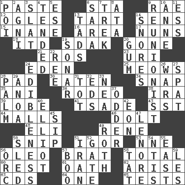 ACROSS 1. Thick mixture 6. R.R. building 9. Actress Charlotte 12. Stares 13. Small pie 14. Elected reps. 15. Empty; void 16. Type of rug 17. Religious women 18. It would 19. Neighbor of Neb. 20. Went 21. Greek god of love 23. RI univ. 24. Locale of original sin 25. Catcalls? 28. Writing tablet 30. Eroded 34. Fastener 35. Black tropical American cuckoo 36. Cowboy competition 38. Retirement account (abbr.) 39. Ear part 41. Sadhe (variant) 43. Fast jet (abbr.) 44. Promenades 46. Dunce 48. Biblical high priest 49. French philosopher Descartes 50. Clip 51. Russian composer Stravinsky 53. Compass dir. 56. Butter sub 57. Naughty child 58. Add up to 60. Repose 61. Pledge 62. Get up 63. Music discs 64. Single 65. Trials DOWN 1. Luau course 2. Hindu god of fire 3. Narrow board 4. Looked after 5. Compass dir. 6. "Two Mules for Sister ____" 7. Long journey 8. "One Day ___ Time" 9. One who advocates reunion 10. Singer Murray 11. Curvy letter 13. Bits 14. Sounds asleep 19. Echolocation 20. Chewing product 22. To sift 24. The property of being fit to eat 26. Armed conflicts 27. Argument over a trivial matter 28. Inside of hand 29. Small Philippine buffalo 31. Small child 32. Begley and Asner 33. Teachers' org. 37. More peculiar 40. American author Paul (1891-1958) 42. A really long time 45. Small drink 47. Poe poem 49. Writer of Portnoy's Complaint (1969) 50. Downhill vehicle 51. SW Asia republic 52. Yard entry 54. Nuclear Threat Initiatives 55. Compass direction 56. The grampus (Milton) 57. Sometimes accompanies a hiss 58. Make lace 59. French article