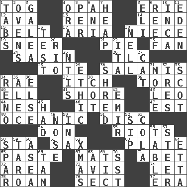 ACROSS 1. Coat; cloak 4. Brightly colored fish 8. 4th largest of the Great Lakes 12. Actress Gardner 13. French philosopher Descartes 14. Grant temporary use of 15. Waist strap 17. Roberta Peters solo 18. Sibling's daughter 19. Contemptuous expression 21. Sliced dessert 23. Air blower 24. Indian antelope 26. Affectionate concern, for short 28. Lug 30. Deli grouping 34. Actress Charlotte 37. Hankering 39. Torque (variant) 40. Pipe bend 41. Dinah or Pauly 43. Lion 44. Tender 46. Detail 47. Eastern Standard Time (abbr.) 48. Pertaining to the sea 51. Flat circle 54. Spanish title 55. Debaucheries 58. R.R. building 61. Saxophone 63. Food holder 65. Thick mixture 67. Floor protectors 71. Collude with 72. Type of rug 73. Deliberation 74. Allow 75. Wander aimlessly 76. Religious group 77. Period DOWN 1. Bar bills 2. Baking chambers 3. An organ shaped like a helmet 4. Mouth or opening 5. For each 6. Cuckoo 7. Pile 8. Connecticut Ivy Leaguer 9. Coral collection 10. South American Indian 11. Paradise 16. Trial 18. 1994 drama film starring Jodie Foster 20. River (Sp.) 22. Call ___ day 25. Nuclear Threat Initiatives 27. Feline 29. Moral principle 30. Tear up 31. Undercover agent 32. Angers 33. Highlander 34. Western Nevada city 35. Actor Baldwin 36. Otherwise 38. Small bed 42. Arab leader 45. Possessed 49. Olfactory organ 50. _ tizzy (2 wds.) 52. Small drink 53. Root beer relative 56. Eating place 57. Bull 58. Practice fight 59. Pacific island yam 60. Toward the sea 62. Dec. holiday 64. Singer James 66. Scottish cap 68. "___ Maria" 69. Nervous spasm 70. Fast jet (abbr.)