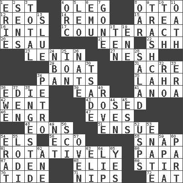 ACROSS 1. Eastern Standard Time (abbr.) 4. Cassini of fashion 8. Von Bismarck 12. Vintage cars 14. San ____ (Riviera town) 15. Type of rug 16. International (abbr.) 17. Neutralize 20. He sold his birthright 21. Car or cant ending 22. Quiet! 23. Soviet premier 1918-24 27. Tender 29. Water vessel 31. 43,560 square feet 34. Leg coverings 35. Cowardly lion portrayer 36. Singer Brickell 39. Ewer handle 41. Small Philippine buffalo 42. Gone 43. Administered medicine 46. Engineer (abbr.) 47. Nights before holidays 48. Immeasurably long periods of time 51. Follow as a consequence or result 54. Raised railways 56. Environmental prefix 58. Fastener 61. Rotating or pertaining to rotation 66. Dad 67. An important port of Yemen 68. Writer Wiesel 69. Agitate 70. Periodic rise and fall of the sea level 71. Pinches, bites 72. Erode DOWN 1. One of the Great Lakes 2. Elected reps. 3. "_____ Recall" 4. The grampus (Milton) 5. Lion 6. Australian flightless bird 7. Went 8. Rowing implement 9. File 13 10. Technician 11. Pledge 13. Turn sharply 18. Nine, plus one 19. Compass dir. 24. Basketball assoc. 25. Electrically charged atom 26. Nathan's nickname 28. First course 30. Sadhe (variant) 32. 17th letter of the Greek alphabet 33. Period 34. Stone: prefix 36. She-sheep 37. Lair 38. Eaten 40. Be footloose 44. Elected rep. 45. Double-curved letter 49. Fish or hair follower 50. _-fi 52. United States Postal Service (abbr.) 53. Related on the mother's side 54. Part of Q.E.F. 55. Farming town in central California 57. Baking chamber 59. Capital of Western Samoa 60. Piece 62. A saturated hydrocarbon 63. Connecticut Ivy Leaguer 64. Mouth edge 65. Affirmative reply