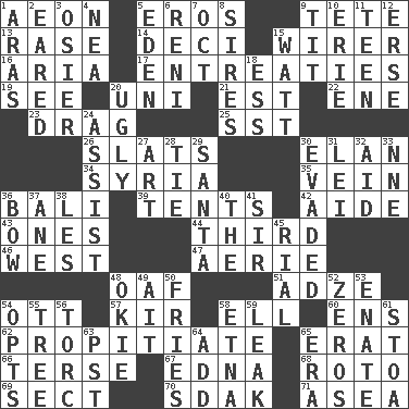 ACROSS 1. Period of immesurable duration 5. Greek god of love 9. Wig 13. Raze (variant) 14. Tenth: prefix 15. One who wires 16. Operatic vocal solo 17. Pleas 19. Observe 20. University (slang) 21. Eastern Standard Time (abbr.) 22. Compass dir. 23. To trail on the ground 25. Fast jet (abbr.) 26. Narrow boards 30. Flair 34. Damascus' land 35. Distinctive style or manner 36. Indonesian resort city 39. Portable shelters 42. Assistant 43. Washington bills 44. One of three equal parts 46. 270 degrees 47. Nest on high 48. Clumsy lout 51. Edge tool used to cut and shape wood 54. Baseball player Mel 57. Apertif with cassis 58. Pipe bend 60. Followers of ems 62. Appease 65. Part of Q.E.F. 66. Laconic 67. Pulitzer Prize-winning author Ferber 68. Printing process, for short 69. Religious group 70. Neighbor of Neb. 71. At sea DOWN 1. Caspian sea tributary 2. Having ears or earlike features 3. Flexible twig of a willow tree 4. Teachers' org. 5. Locale of original sin 6. Painter Guido (1575-1642) 7. Sep. follower 8. Titles for men of rank and authority 9. Teat (slang) 10. 4th largest of the Great Lakes 11. Adolescent 12. Celtic language 15. Electrical Unit 18. Double-curved letter 20. Unsightly 24. Aid 27. Nonscientific branch of learning 28. Make a knot 29. Before Barbara or Clara 30. Eluded 31. Flowery wreath 32. Assist 33. Compass dir. 36. Ribbon knot 37. One (Scot) 38. French article 40. Definite Article 41. Title for a knight 45. Monetary unit of Yemen 48. Migrant worker of the '30s 49. Small island 50. Strips of potato fried in deep fat 52. Nothings 53. Related on the mother's side 54. Chooses 55. Woody plant 56. Torque (variant) 58. Inactive volcano in Sicily 59. Path through which fluid escapes 61. Portico 63. Pacific Standard Time (abbr.) 64. Say or write further 65. Period