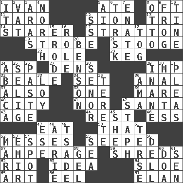 ACROSS 1. "Terrible" tsar 5. Had dinner 8. Often (poetically) 11. Edible starchy tuberous root 12. The Jewish people; Israel 13. Three (prefix) 14. A viewer who gazes fixedly 17. Ski resort town in Vermont 19. Disco prop 21. Moe Howard, for one 22. Opening into or through something 23. Barrel 24. Viper 27. Hiding places for outlaws 29. Mischievous child 32. Memphis, Tenn. Street 34. Arrange properly for use 36. Of or related to the anus 37. In addition 38. Single 39. Female horse 40. Municipality 41. And not 42. Before Barbara or Clara 43. Grow older 44. Take ten 46. Curvy letter 47. Ingest 50. Not this but _ 52. Makes clutter 55. Oozed 57. Electrical Measurement 59. Fragments 62. _ de Janeiro 63. It may be bright or harebrained 64. A type of plum 65. Tate display 66. Snakelike fish 67. Liveliness DOWN 1. It is 2. Large container 3. Caspian sea tributary 4. 0 degrees 5. Small island 6. Cod relative 7. Maternal 8. Von Bismarck 9. Toadlike animal 10. Prong on a fork 12. Compass dir. 15. Wear away 16. Hero or heavy, e.g. 18. Coat; cloak 20. Gillaume's butler role 24. Phillipine bananalike plant 25. Former Milwaukee Brewers owner Bud 26. Thick mixture 28. Sir (Sp.) 29. Lacking in sense or substance 30. Shops 31. Entreaties 33. Myrna of the movies 35. Cylindrical with tapered ends 36. Wet nurse (var.) 42. Staphylococcus 45. "______ My Girl" (Turtles hit) 47. Compass dir. 48. Nest on high 49. Sadhe (variant) 51. Laconic 52. Hindu Mythology: god of death 53. Independent ruler or chieftain 54. Specific locale 55. Ocean 56. Small valley 58. Set 60. ___ good deed 61. Elected rep.
