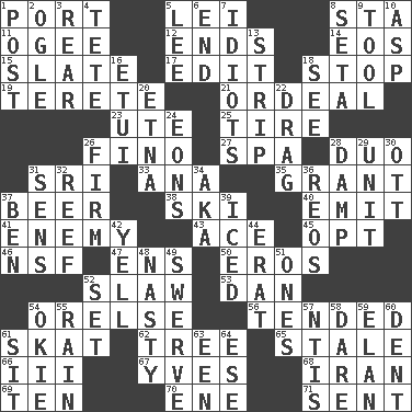 ACROSS 1. Left side of a ship or aircraft 5. Luau accessory 8. R.R. building 11. Double curve, resembling the letter S 12. Extremities 14. Greek goddess of the dawn 15. Chalkboard 17. Prepare for publication 18. Discontinue 19. Cigar-shaped 21. Severe or trying experience 23. Shoshoni 25. Become fatigued 26. Fine (Spanish) 27. Health resort 28. Superhero pair 31. _ Lanka 33. Santa ___, CA 35. Let have 37. Fermented drink made from hops 38. What Jean-Claude Killy likes to do 40. Send forth 41. Foe 43. Adept person 45. Choose 46. Science/research agcy. 47. Followers of ems 50. Greek god of love 52. Cole _ (cabbage dish) 53. One of the 12 tribes of Israel 54. Threatening words 56. Watched over 61. Three-handed card game 62. Family _ (genealogy) 65. Having lost freshness 66. One more than two 67. Jacques Cousteau's middle name 68. SW Asia republic 69. Nine, plus one 70. Compass dir. 71. Emitted DOWN 1. Mail 2. Stare 3. Rump 4. Wig 5. Area sheltered from the wind 6. Conclude 7. Foolish or stupid persons 8. Stalk of a moss capsule 9. Implement 10. Viper 13. Empty completely 16. Needle holder 18. Perceive with the eye 20. Inactive volcano in Sicily 22. To trail on the ground 24. Immeasurably long periods of time 26. Securely fixed in place 28. Moist 29. A single undivided whole 30. Baseball player Mel 31. Elected reps. 32. Coral ridge 34. Alias (abbr.) 36. Vintage cars 37. Benjamin's nick name 39. On the rocks 42. Shout 44. Part of Q.E.F. 48. Offensive 49. Turn aside suddenly 51. Singles 52. Put into a specified state 54. Migrant worker of the '30s 55. Water falling in drops from the sky 57. Nuclear Threat Initiatives 58. Have the gumption 59. Flair 60. Incision 61. Be seated 63. Car or cant ending 64. Compass dir.