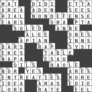 ACROSS 1. Floor covering 4. "You Light Up My Life" star Conn 8. Singer James 12. Type of rug 14. Arabian gulf 15. Perceives with the eye 16. Monetary unit of Yemen 17. Unrelated to defense, as in spending 20. Hearing organs 21. Mouth or opening 22. Parent Teacher Association (abbr.) 23. Having a sole or soles 27. Queen of England 1702-14 29. Toward shelter 31. Washington bills 34. Bee-related 35. Restaurants 36. Oblong pieces of solid material 39. Strike 41. System (abbr.) 42. Supplements with great effort 43. Eating place 46. California wine valley 47. Son of Isaac 48. Lubricates 51. White Person, in Hawaii 54. Not either 56. It is so 58. Ancient Greek god of war 61. Pleas 66. Greater amount 67. The content of cognition 68. Ancient river in northeast Turkey 69. Singer Brickell 70. Old wives' tales, e.g. 71. Pace 72. Snakelike fish DOWN 1. Female horse 2. Roberta Peters solo 3. Pulls apart 4. One of the 12 tribes of Israel 5. Wedding promise 6. Lair 7. _ china 8. Compass dir. 9. 3-inch nail 10. Trial 11. Toward the sea 13. In addition 18. Epoch 19. Air blower 24. Pet locale 25. Connecticut Ivy Leaguer 26. Letter starter 28. Annoying sound 30. Maternal 32. Followers of ems 33. Fast jet (abbr.) 34. Slender Brazilian palm 36. Benjamin's nick name 37. Alias (abbr.) 38. Newsperson 40. Romantic infatuation 44. Sound made by sheep 45. Nilotic language 49. Sodium hydroxide 50. Ocean 52. Unable to walk 53. Wear away 54. Famous astronaut Armstrong 55. Southwest Nigerian state 57. Play the lead 59. One of the Great Lakes 60. Sew up the eyelids of hawks and falcons 62. Actress Charlotte 63. Retirement account (abbr.) 64. Consume 65. Compass dir.