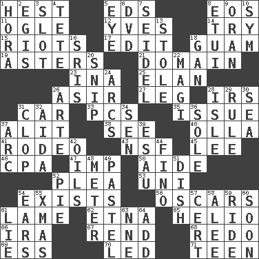 ACROSS 1. Command 5. Begley and Asner 8. Greek goddess of the dawn 11. Stare 12. Jacques Cousteau's middle name 14. Attempt to accomplish something 15. Debaucheries 17. Prepare for publication 18. Island territory of the United States 19. Michaelmas daisies 21. Realm 23. _ tizzy (2 wds.) 25. Enthusiasm 26. SW Saudi Arabia district 27. Part of a journey 28. Big collection agency 31. Auto 33. Personal Computers (abbr.) 35. Come out of 37. Came down and settled, as after flight 38. Observe 40. Rounded earthenware pot or jar 41. Cowboy competition 43. Overdraft (abbr.) 45. Area sheltered from the wind 46. Accounting whiz (abbr.) 47. Mischievous child 50. Assistant 52. Entreaty 53. Single; one (prefix) 54. Is extant 56. Motion picture awards 61. Unable to walk 62. Inactive volcano in Sicily 65. Sun: prefix 66. Retirement account (abbr.) 67. Tear apart 68. Do over again 69. Double-curved letter 70. Directed 71. Adolescent DOWN 1. Israeli folk dance 2. The front part of a cuirass 3. Groove 4. False hair 5. Sight organ 6. Movie disc 7. A glass for beer 8. Needle holder 9. Northwest Algerian city 10. Symbol (abbr.) 13. Fur scarf 16. Indian titles of respect 18. Separate the seeds from cotton 20. Clip 22. Wise men 24. Curves 26. Johnson of "Laugh-In" 28. Capri or Wight 29. Court order 30. Ocean 31. Hoof sound 32. Opera by Verdi 34. Elected rep. 36. Flatfish 37. Curve 39. Son of Isaac 42. Lubricates 44. A pale, very dry sherry 48. Distance measurement 49. Soft color 51. Food container 52. Sliced dessert 54. Hearing organs 55. Dec. holiday 57. Certainty 58. Toward shelter 59. Travel on an animal 60. Within a short period 61. Falsehood 63. Compass dir. 64. Say or write further