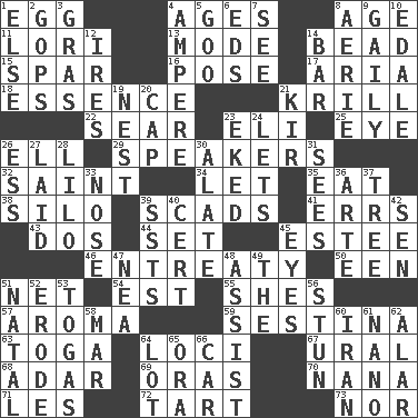 ACROSS 1. Oval reproductive body of a fowl 4. Matures 8. Ripen 11. Australian parrot (variant) 13. Method 14. Necklace unit 15. Practice fight 16. Introduce or present, as a question 17. Operatic vocal solo 18. Center 21. The principal food of baleen whales 22. Burn superficially 23. Biblical high priest 25. Sight organ 26. Pipe bend 29. Orators 32. Inhabitant of Heaven 34. Allow 35. Ingest 38. Grain storage tower 39. Loads 41. Blunders 43. Two (Sp.) 44. Arrange properly for use 45. First name in cosmetics 46. Plea 50. Car or cant ending 51. Fish or hair follower 54. Eastern Standard Time (abbr.) 55. "______ My Girl" (Turtles hit) 57. Scent 59. French poetic form 63. Ancient Roman robe 64. Locales 67. Mountain range 68. The sixth month of the Jewish calendar 69. Mouths or openings 70. Nanny 71. French article 72. Small pie 73. Or not DOWN 1. Otherwise 2. Republicans 3. Pate de foie ____ 4. Electrical Unit 5. Thick or sticky substance 6. Begley and Asner 7. Observe 8. Nest on high 9. Lightheartedly 10. Peak District village in England 12. Angers 14. Tavern 19. Egg locale 20. Head covering 21. Apertif with cassis 23. Supplemented with great effort 24. Allows 26. Double-curved letter 27. Put down 28. _ and Stitch 30. Having winglike extensions 31. Perceives with the eye 33. Sense of smell 36. Johnson of "Laugh-In" 37. Relationship diagram 39. Fast planes 40. An absolute certainty 42. Elected rep. 45. Sight organs 47. Teachers' org. 48. Aid 49. Definite Article 51. Relating to or accompanying birth 52. Wear away 53. Ancient Roman robes 56. Make senseless or dizzy 58. Impair 60. SW Asia republic 61. Billionth: prefix 62. Having or resembling wings 64. Car dealer's back yard 65. Mouth or opening 66. 4-wheeled motor vehicle