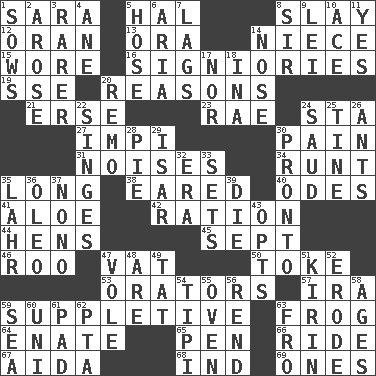 ACROSS 1. "Two Mules for Sister ____" 5. Actor Linden 8. Kill 12. Northwest Algerian city 13. Mouth or opening 14. Sibling's daughter 15. Had on 16. Seigniories (variant) 19. Compass dir. 20. Thinks logically 21. Celtic language 23. Actress Charlotte 24. R.R. building 27. Body of Kaffir warriors 30. Ache 31. Annoying sounds 34. The smallest animal of a litter 35. Yearn 38. Having ears or earlike features 40. Lyric poems 41. _ vera 42. Food allowance for one day 44. Coop moms 45. Back-to-school mo. 46. Friend of Pooh 47. Large container 50. Casino tip 53. Speakers 57. Retirement account (abbr.) 59. Supplementary 63. Tree-dwelling hopper 64. Maternal 65. Fenced enclosure 66. Travel on or in a vehicle 67. Opera by Verdi 68. Working for oneself (abbr.) 69. Singles DOWN 1. Sty mamas 2. Came up 3. More uncommon 4. A saturated hydrocarbon 5. Stockings 6. Operatic vocal solo 7. Falls behind 8. Title for a knight 9. Luau accessory 10. Adept person 11. Affirmative reply 14. Sense of smell 17. Or not 18. _ tizzy (2 wds.) 20. San ____ (Riviera town) 22. Scorches 24. Saudi Arabian king (1953-1964) 25. Prong on a fork 26. Pismires 28. Sliced dessert 29. Austrian river, tributary to the Danube 30. Right away 32. Period 33. Arranges properly for use 35. Cowardly lion portrayer 36. Butter sub 37. Words to Nanette 39. Expire 43. Elects 47. Short-tailed, large-bodied rat 48. "We ___ not amused" (Victoria) 49. Make lace 51. Japanese brewing company 52. Eat (away) 54. Native american tent (variation) 55. Baking chamber 56. Tear apart 58. Grows older 59. Ocean 60. Single; one (prefix) 61. Groovy apt. 62. Parent Teacher Association (abbr.) 63. Away