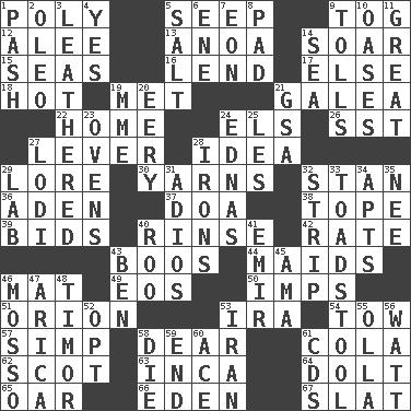 ACROSS 1. Many (prefix) 5. Ooze 9. Coat; cloak 12. Toward shelter 13. Small Philippine buffalo 14. Fly high 15. Oceans 16. Grant temporary use of 17. Otherwise 18. Being at a high temperature 19. Was introduced to 21. An organ shaped like a helmet 22. Residence 24. Raised railways 26. Fast jet (abbr.) 27. Prying instrument 28. It may be bright or harebrained 29. Old wives' tales, e.g. 30. Tall tales 32. Comedian Laurel of Laurel & Hardy 36. Arabian gulf 37. ___ good deed 38. Drink excessively 39. Auction offers 40. Wash lightly 42. Pace 43. Scornful sounds 44. Women servants 46. Floor covering 49. Greek goddess of the dawn 50. Naughty children 51. Greek mythologigal hunter 53. Lyricist Gershwin 54. Pull behind 57. Simple or foolish person 58. Letter starter 61. Root beer relative 62. Native of Scotland 63. South American Indian 64. Stupid person 65. Boat paddle 66. Genesis locale 67. Narrow board DOWN 1. Romantic infatuation 2. Margarine 3. Tough but pliablecoriaceous 4. Affirmative reply 5. Table seasoning 6. Compass dir. 7. Period of immesurable duration 8. Writing tablet 9. For Whom the Bell _____ 10. Fertile tracts in a desert 11. Relatively large 14. Ocean 19. Madame (abbr.) 20. Suggestive of the supernatural 21. Girls' org. (abbr.) 23. Baking chambers 24. Ferber et al. 25. French article 27. Farming town in central California 28. Metal shackles 29. Experiment locale 31. Goodbye (Sp.) 32. Empty completely 33. Inedible or poisonous agaric 34. Flats, for short 35. Born 40. Friend of Pooh 41. Independent ruler or chieftain 43. Benjamin's nick name 45. Nanny (var.) 46. With motion or animation 47. N. Chile seaport 48. The easternmost of the Lesser Sundas 52. Elect 53. SW Asia republic 55. Spanish pot 56. Electrical Unit 58. Pass on 59. Conclusion 60. Adept person 61. Music discs