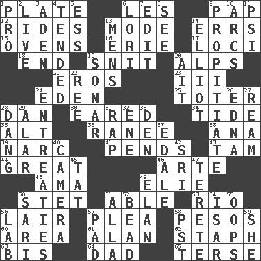ACROSS 1. Food holder 6. French article 9. Infant food 12. Amusement-park features 13. Method 14. Blunders 15. Baking chambers 16. 4th largest of the Great Lakes 17. Event scenes 18. Conclusion 19. In a ____ (agitated or irritated) 20. High mountains 21. Greek god of love 23. One more than two 24. Paradise 25. Carrier 28. Daniel's nick name 30. Having ears or earlike features 34. Periodic rise and fall of the sea level 35. Keyboard modifier key 36. Indian princess (variant) 38. Santa ___, CA 39. Drug cop 41. Hangs 43. Scottish cap 44. Relatively large 46. Johnson of "Laugh-In" 48. Housemaid (var.) 49. Writer Wiesel 50. Proofreading order 51. Competent 53. _ de Janeiro 56. Den 57. Entreaty 58. Mexican monetary units 60. Length times width 61. ____ Jay Lerner 62. Staphylococcus 63. Altar cloth linen 64. June honoree 65. Laconic DOWN 1. Adept person 2. Moving, as bait 3. Arabian gulf 4. Looked after 5. Curvy letter 6. Australian parrot (variant) 7. Prepare for publication 8. Observe 9. Appease 10. Curves 11. Air pressure measure (abbr.) 13. Not women's 14. American author Paul (1891-1958) 19. Underwater navigation system 20. Small island 22. To sift 24. Pleas 26. Pulitzer Prize-winning author Ferber 27. 480, 500 or 516 sheets of paper 28. Mild oath, euphamism for damn 29. Having or resembling wings 31. Hit sharply and swiftly 32. Compass dir. 33. Lair 37. Peak District village in England 40. Device for capturing images 42. _ Lanka 45. Make lace 47. Cylindrical with tapered ends 49. Liveliness 50. Indian skirt 51. Silent film actress Nazimova 52. Necklace unit 54. Austrian river, tributary to the Danube 55. I made a mistake 56. Experiment locale 57. Groovy apt. 58. Pacific Standard Time (abbr.) 59. A female animal or person