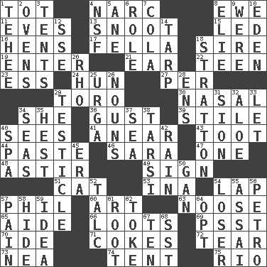ACROSS 1. Small child 4. Drug cop 8. She-sheep 11. Nights before holidays 13. Snout, nose 15. Directed 16. Coop moms 17. Chap (slang) 18. Beget 19. Keyboard key 21. Hearing organ 22. Adolescent 23. Double-curved letter 24. Attila the _ 27. For each 29. "Corrida" creature 30. Relating to the nose 34. A female animal or person 36. Abrupt rush of wind 39. Vertical member of a panel or frame 40. Perceives with the eye 41. Approach 43. A blast of a horn 44. Thick mixture 46. "Two Mules for Sister ____" 47. Single 48. Moving or stirring 49. Public display of a written message 51. Feline 53. _ tizzy (2 wds.) 54. Pet locale 57. Silvers or Donahue 60. Nonscientific branch of learning 63. Trap for birds or small mammals 65. Helper 66. Plunders 69. Inconspicuous attention getter 70. Binary compound 71. Popular sodas 72. Pull into pieces 73. Teachers' org. 74. Portable shelter 75. River (Sp.) DOWN 1. Giggle 2. Baking chambers 3. Portable shelters 4. Overdraft (abbr.) 5. A saturated hydrocarbon 6. Hero or heavy, e.g. 7. Root beer relative 8. Writer Wiesel 9. Past tense of be (plural) 10. Paradise 12. Compass dir. 14. Canvas cover 18. Ski resort town in Vermont 20. 17th letter of the Greek alphabet 25. Capital and largest city of Mongolia 26. Parts of speech 28. Followers of ems 29. A testis 31. The Jewish people; Israel 32. Medicinal plant 33. Allow 34. Oceans 35. Behest 37. Ocean 38. Tarsus (plural) 40. Health resort 42. Precipitation 45. Period 50. Separate the seeds from cotton 52. Baby powder 54. Failure 55. Slender Brazilian palm 56. Stone: prefix 57. Ache 58. Flintstone garb 59. The main thing one is thinking about 61. Carrot, for example 62. Puff or smoke 64. Choose 67. "___ Little Indians" 68. Fast jet (abbr.)