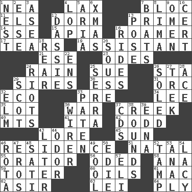 ACROSS 1. Teachers' org. 4. Not strict 7. Alliance 11. Raised railways 12. Dormintory (informal) 13. First class 14. Compass dir. 15. Capital of Western Samoa 16. Nomad 17. Pulls apart 19. Helper 21. Compass dir. 23. Lyric poems 24. Precipitation 25. Institute legal proceedings 26. R.R. building 29. Fathers 30. Double-curved letter 31. The grampus (Milton) 32. Environmental prefix 33. Before (prefix) 34. Area sheltered from the wind 35. Car dealer's back yard 36. Armed conflict 37. Small stream 40. Mountains (abbr.) 41. Call ___ day 42. Texas town _ City 43. Old wives' tales, e.g. 45. Player for Phoenix 46. Home 51. Brizilian seaport 55. Speaker 56. Wrote a lyric poem 58. Santa ___, CA 59. Carrier 60. Petroleums 61. Big _ 62. SW Saudi Arabia district 63. Luau accessory 64. Strand of rope, yarn or thread DOWN 1. Egg locale 2. Otherwise 3. Toward the sea 4. Trim (branches) 5. Roberta Peters solo 6. Dec. holiday 7. Naughty children 8. Pale green bean 9. Sign of something about to happen 10. Foregone conclusion 12. Small ungulate mammals of Africa 13. Airs 16. Amusement-park features 18. Bring up, as a child 20. Lush 22. Followers of ems 24. Disturbances 25. Spanish missionary in California 26. Having a sole or soles 27. Long journey 28. Adept person 29. Highlander 32. Shade tree 33. Eucharist need 36. One who wires 37. Music discs 38. Periods in a boxing match 39. Pulitzer Prize-winning author Ferber 43. 61 cubic inches 44. Aroma 46. Round or rotation of duties 47. Greek god of love 48. Suttee (variant) 49. Calm and collected 50. Singer Brickell 52. Pack (down) 53. Of or related to the anus 54. Made of lace 57. Connecticut Ivy Leaguer