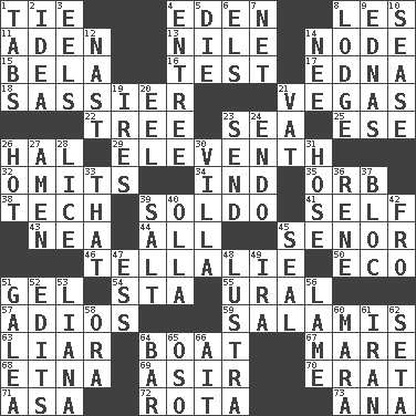 ACROSS 1. Make a knot 4. Genesis locale 8. French article 11. Arabian gulf 13. The longest river in the world 14. Connecting point 15. Actor Lugosi 16. Trial 17. Pulitzer Prize-winning author Ferber 18. More lively and spirited 21. Viva Las _ 22. Family _ (genealogy) 23. Ocean 25. Compass dir. 26. Actor Linden 29. Veterans Day date 32. Leaves out 34. Indiana (abbr.) 35. Globe 38. Technical work 39. Twentieth part of a lira 41. Oneself 43. Teachers' org. 44. 100% 45. Sir (Sp.) 46. Copy Pinocchio 50. Environmental prefix 51. Set 54. R.R. building 55. Mountain range 57. Goodbye (Sp.) 59. Deli grouping 63. One who doesn't tell the truth 64. Water vessel 67. Female horse 68. Inactive volcano in Sicily 69. SW Saudi Arabia district 70. Part of Q.E.F. 71. White ___ sheet 72. Roll call or roster of names 73. Santa ___, CA DOWN 1. Bar bills 2. It may be bright or harebrained 3. Snakelike fish 4. Main course 5. Expire 6. Raised railways 7. Remaining after all deductions 8. Inn 9. Ferber et al. 10. Gospel singer Marvin 12. Political cartoonist Thomas 14. Born 19. Angers 20. Snakelike fish 21. Large container 23. Post 24. Inside; within (prefix) 26. Being at a high temperature 27. So be it 28. Louse (plural) 30. Country estate 31. Stockings 33. Not this but _ 36. French philosopher Descartes 37. Alliance 39. Table seasoning 40. Water jar 42. Back 45. Lick closed 47. Curvy letter 48. A period of five years 49. Retirement account (abbr.) 51. An organ shaped like a helmet 52. Proofreads 53. Climbing, woody, usually tropical vines 56. Unable to walk 58. Mouth or opening 60. Hindu Mythology: god of death 61. SW Asia republic 62. Bristle 64. Oblong piece of solid material 65. Bear (Spanish) 66. Small island