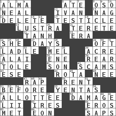 ACROSS 1. _ mater 5. Had dinner 8. Bear (Spanish) 11. Be tempered by heat 12. "Terrible" tsar 13. Tired old horse 14. Keyboard key 17. A testis 19. A period of five years 21. Cigar-shaped 22. Hyperbolic tangent 23. Period 24. A female animal or person 27. 24-hour periods 29. Often (poetically) 32. Dipping utensil 34. Cartoonist voice _ Blanc 36. 1/640 square mile 37. Jai _ 38. Compass dir. 39. Bring up, as a child 40. Lacquered or enameled metalware 41. Manchild 42. Fraudulent business schemes 43. Compass dir. 44. Roll call or roster of names 46. Born 47. Strike 50. Monthly bill 52. Prior to 55. Gossips 57. One to whom something is allotted 59. Break 62. Cards in a Roman deck? 63. Angers 64. Greek god of love 65. Was introduced to 66. Period of immesurable duration 67. Plant excrements DOWN 1. Added to 2. Area sheltered from the wind 3. Promenade 4. Native American of Southwest Alaska 5. "___ Maria" 6. Clothes sense 7. Keyboard key 8. At one time in the past 9. Table seasoning 10. Double curve, resembling the letter S 12. Call ___ day 15. Sadhe (variant) 16. Inactive volcano in Sicily 18. Retirement account (abbr.) 20. Poems 24. Schedule 25. Saint headwear 26. Peak District village in England 28. Sir (Sp.) 29. Sea 30. Movie unit 31. Laconic 33. Untruth 35. Poe poem 36. Curve 42. Before Barbara or Clara 45. Be inclined (to) 47. Friend of Pooh 48. Nick name for Arthur 49. Stone: prefix 51. Corrects by punishment or discipline 52. Lip ointment 53. Writer Wiesel 54. Secret move to avoid paying debts 55. Consenting reply 56. "Two Mules for Sister ____" 58. Car or cant ending 60. Grand Old Party 61. Curvy letter