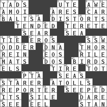 ACROSS 1. Small amounts or degrees 5. Shoshoni 8. Deep reverence 11. Mine, in Marseilles 12. Ancient Greek god of war 13. Automobile 14. Greek mezzo-soprano Agnes 17. What propaganda does 19. Looked after 21. Cylindrical with tapered ends 22. Wither 23. Ocean 24. Neckwear 27. Greek god of love 29. Compass dir. 32. More peculiar 34. Heredity factor (abbr.) 36. Son of Odin 37. It's straight from the horse's mouth 38. Greek goddess of the dawn 39. Cause heat under the collar 40. Floor coverings 41. Two (Sp.) 42. Avian creatures 43. Raised railways 44. Hoop that covers a wheel 46. Small child 47. Parent Teacher Association (abbr.) 50. Oceans 52. A viewer who gazes fixedly 55. Ringlike coral islands and reefs 57. Newsperson 59. Oozed 62. ___ a Wonderful Life 63. Drop; flow; fall 64. Have the gumption 65. Perceive with the eye 66. Snakelike fish 67. Comedian Laurel of Laurel & Hardy DOWN 1. Keyboard key 2. Wet nurse (var.) 3. Stupid person 4. Settings 5. RI univ. 6. Trials 7. First name in cosmetics 8. Measure of real estate 9. Electrical Unit 10. Celtic language 12. Increase 15. Scornful expression 16. The sixth month of the Jewish calendar 18. Mouth or opening 20. Eaten away 24. Singer Mel 25. Standard of perfection 26. Proofreads 28. Snob 29. Upper-body garment 30. Twentieth part of a lira 31. Take or capture by force 33. Followers of ems 35. Help 36. Three (prefix) 42. Memphis, Tenn. Street 45. Vintage cars 47. Adept person 48. Laconic 49. Nick name for Arthur 51. Bobsleighs 52. Indian titles of respect 53. Wig 54. Domed church section 55. "We ___ not amused" (Victoria) 56. Argument over a trivial matter 58. Pipe bend 60. Epoch 61. Lair