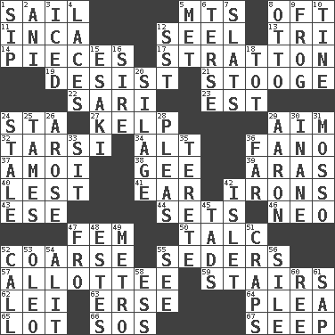 ACROSS 1. Move on water 5. Mountains (abbr.) 8. Often (poetically) 11. South American Indian 12. Stitch closed the eyes of (a falcon) 13. Three (prefix) 14. Parts 17. Ski resort town in Vermont 19. Stop 21. Moe Howard, for one 22. Indian skirt 23. Eastern Standard Time (abbr.) 24. R.R. building 27. Seaweed 29. Direct toward a target or goal 32. Tarsus (plural) 34. The first octave above the treble staff 36. Papal veil 37. Mine, in Marseilles 38. Unit of force equal to gravity 39. Ancient river in northeast Turkey 40. For fear that 41. Hearing organ 42. Removes the wrinkles 43. Compass dir. 44. Puts into a specified state 46. Modern: prefix 47. Opposite of masc. 50. Baby powder 52. Unrefined 55. Spring feasts 57. One to whom something is allotted 59. Flight of steps 62. Luau accessory 63. Celtic language 64. Entreaty 65. Car dealer's back yard 66. Mayday 67. Ooze DOWN 1. Small drink 2. Cuckoo 3. On the rocks 4. Shoestrings 5. Was introduced to 6. Laconic 7. Narrow boards 8. Von Bismarck 9. Toadlike animal 10. Prong on a fork 12. Fast jet (abbr.) 15. 1973 Nobel Price Winner (Physics) Leo 16. Title for a man of rank and authority 18. Small child 20. Fodder prepared in a silo 24. Having lost freshness 25. Corrects by punishment or discipline 26. Came up 28. Entreaties 29. Composer Copland 30. Empty; void 31. With motion or animation 33. Be seated 35. Cigar-shaped 36. Distant 42. Small island 45. Small boys 47. Away 48. _____ Park, CO 49. Paris' subway 51. Dice game 52. Give a ring to 53. Margarine 54. Set down 55. Observe 56. Drop; flow; fall 58. Curvy letter 60. To separate or throw off 61. Plant excrement