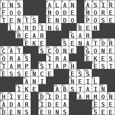 ACROSS 1. Followers of ems 4. ____ Jay Lerner 8. SW Saudi Arabia district 12. Egg _ yung 13. Method 14. Greater amount 15. Portable shelters 18. Inside; within (prefix) 19. Airs 20. Preparing or cooking with lard 22. Benjamin's nick name 23. Hitchcock's "____ Window" 24. Slender fish 25. Make supply last 26. Legislator 30. Domesticated feline 33. Biscuitlike quick bread 36. Went 37. Mouths or openings 39. Lyricist Gershwin 40. Makes supply last 41. Pack (down) 42. Staphylococcus 44. Eastern Standard Time (abbr.) 45. Gist 47. Curvy letter 50. Cuckoo 51. Famous astronaut Armstrong 53. Mamie's husband 54. Choose not to consume 57. Hub of activity 59. "You Light Up My Life" star Conn 61. ID or VA city 63. The sixth month of the Jewish calendar 64. The content of cognition 65. Compass dir. 66. Cub Scout units 67. Immeasurably long periods of time 68. Observe DOWN 1. Bank Draft (abbr.) 2. Christmas carol 3. Echolocation 4. So be it 5. Yearn 6. Increase 7. Modern: prefix 8. Electrical Measurement 9. Within a short period 10. Big collection agency 11. To riddle 16. Family _ (genealogy) 17. Neighbor of Neb. 21. Angers 22. Forbid 24. Turn to the right 26. Fastener 27. Casino tip 28. Singles 29. Relief 30. ____ d'Azur (French Riviera) 31. Caspian sea tributary 32. Scottish caps 34. Quote 35. Mouth or opening 38. Orators 42. _-fi 43. Coop moms 46. Compass dir. 48. Bristle 49. Thailand, formerly 52. Citrus fruits 53. _ the terrible 54. An important port of Yemen 55. Prejudice 56. Sense of smell 57. Possessed 58. Binary compound 59. Pass on 60. Wedding promise 62. Born