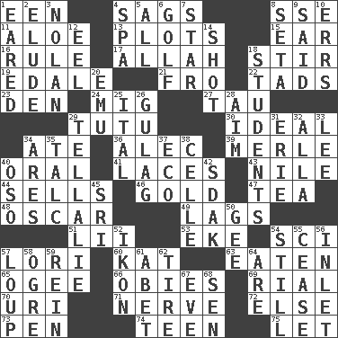 ACROSS 1. Car or cant ending 4. Droops 8. Compass dir. 11. Medicinal plant 13. Schemes 15. Hearing organ 16. Court order 17. Assad's deity 18. Use a swizzle stick 19. Peak District village in England 21. Away 22. Small boys 23. Lair 24. Russian fighter aircraft 27. The 19th letter of the Greek alphabet 29. Ballerina skirt 30. Standard of perfection 34. Had dinner 36. Actor Baldwin 39. Haggard of country music 40. Taken by mouth 41. Shoestrings 43. "Death on the ____" 44. Makes a sale 46. Precious metal 47. Beverage made from leaves 48. Motion picture award 49. Falls behind 51. Cards in a Roman deck? 53. Make supply last 54. _-fi 57. Australian parrot (variant) 60. Krazy ___ of comics 63. Ingested 65. Double curve, resembling the letter S 66. Off-Broadway awards 69. Monetary unit of Yemen 70. RI univ. 71. Impudent aggressiveness 72. Otherwise 73. Animal enclosure 74. Adolescent 75. Allow DOWN 1. Having ears or earlike features 2. Evade 3. Pitcher Ryan 4. Health resort 5. Everything 6. _ course 7. Play the lead 8. Stalk of a moss capsule 9. Stated 10. Blunders 12. Snakelike fish 14. Opportunity 18. SAT takers 20. Australian flightless bird 25. Slanted text style (abbr.) 26. POW camp 28. Direct toward a target or goal 29. Copy Pinocchio 31. 4th largest of the Great Lakes 32. Silent film actress Nazimova 33. Area sheltered from the wind 34. Ancient Greek god of war 35. Baby powder 37. Environmental prefix 38. Cell (Danish) 40. Bear (Spanish) 42. Neighbor of Neb. 45. _ Lanka 50. Turn to the right 52. Visual representation of an object 54. Free of sound 55. Desist 56. An arm off of a larger body of water 57. Central Nebraska county 58. Legendary monster 59. It's straight from the horse's mouth 61. Collude with 62. Hoop that covers a wheel 64. "We ___ not amused" (Victoria) 67. Night before a holiday 68. Elected rep.