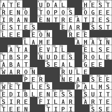 ACROSS 1. Had dinner 4. Hereditary estate 8. Behest 12. Western Nevada city 14. Traditional theme or motif 16. Double curve, resembling the letter S 17. SW Asia republic 18. Pleas 20. _____ Park, CO 22. Hearing organ 23. Fast jet (abbr.) 24. Area sheltered from the wind 25. Age 28. Portuguese money of account (variant) 30. Unable to walk 31. At full speed 35. "One Day ___ Time" 37. Morally bad or wrong 40. Otherwise 41. Cook's measure (abbr.) 42. Unadorned figures 44. Hero or heavy, e.g. 45. Blind as ____ 46. Lick closed 47. Unit of force equal to gravity 48. Make _____ (do battle with) 50. Court order 52. For each 54. Teachers' org. 55. Perceive with the eye 58. Dripping 61. French article 63. Insides of hands 65. The property of being fit to eat 70. Set of matching outer garments 71. The founder of a family 72. Of or pertaining to a thread or threads 73. Johnson of "Laugh-In" 74. Adolescent 75. Native american tent (variation) 76. Compass dir. DOWN 1. Satellite of Uranus 2. Laconic 3. Maternal 4. Shoshoni 5. Spanish title 6. Fitting 7. Old wives' tales, e.g. 8. Being at a high temperature 9. Armor plate that protects the chest 10. Perceives with the eye 11. Trial 13. Single 15. Scorch 19. Type of rug 21. Ocean 26. Presage 27. Mole, birthmark 29. Develop 30. Portable computer 32. Medicinal plant 33. Capri or Wight 34. Born 35. Swedish rock group 36. Russian ruler of old 38. Binary compound 39. Acquire or gain knowledge or skills 41. The 23rd letter of the Hebrew alphabet 43. Change direction abruptly 49. 1994 drama film starring Jodie Foster 51. Infant locale 53. Coral collection 55. Plays smoothly or legato 56. Sends forth 57. First name in cosmetics 58. 270 degrees 59. Singer Brickell 60. Become fatigued 62. In a ____ (agitated or irritated) 64. White ___ sheet 66. Benjamin's nick name 67. Biblical high priest 68. Plant excrement 69. _ Lanka