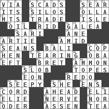 ACROSS 1. By way of 4. Oodles 9. Wither 13. ___ a Wonderful Life 14. Grain storage towers 15. Water jar 16. Mountains (abbr.) 17. Swap 18. Capri or Wight 19. Lubricate 21. To free from 22. An organ shaped like a helmet 24. Indian skirt 26. A saturated hydrocarbon 27. Nick name for Arthur 29. Among 30. Seines 31. Indonesian resort city 33. Police officer (slang) 36. Layer 37. Pulling into pieces 40. Chief or king in Benin or Nigeria 41. Newt 42. Cy Young winner Saberhagen 43. ID or VA city 45. Messy guy 47. Drinks excessively 48. Period of immesurable duration 49. Do over again 50. Oozy 52. A female animal or person 54. Followers of ems 56. Drawstring 57. At or in the front 59. Biblical high priest 61. Writer Wiesel 62. Impudent aggressiveness 63. Not either 64. Baltic tributary 65. NE Netherlands city 66. Beverage made from leaves DOWN 1. Zeal 2. "Tell ____ the Marines!" 3. Helper 4. Fast jet (abbr.) 5. High-altitude cloud 6. Jai _ 7. Texas town _ City 8. Compass dir. 9. Dirtied 10. Otherwise 11. Silent film actress Nazimova 12. Actress Charlotte 20. (Had) reclined 22. Homeless child 23. Black tropical American cuckoo 25. Repose 27. American tennis player Robert 28. Coral ridge 29. Came down and settled, as after flight 31. Sharp remark 32. "We ___ not amused" (Victoria) 33. Part 34. Mitch Miller's instrument 35. Zero-star reviews 38. Dark wood 39. Yard entry 44. Method 45. Sowing specialist 46. Chop off 49. Break or tear apart 50. Disposed of to a purchaser 51. 4th largest of the Great Lakes 52. "______ My Girl" (Turtles hit) 53. Possessive pronoun 55. A type of plum 56. Corporate head (abbr.) 57. Santa ___, CA 58. Lair 60. Lyricist Gershwin