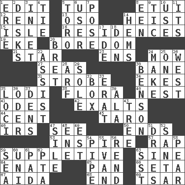 ACROSS 1. Prepare for publication 5. Uncastrated adult male sheep 8. Needle case 12. Painter Guido (1575-1642) 13. Bear (Spanish) 14. Robbery 15. Small island 16. Dwellings 19. Supplement with great effort 20. Mood resulting from idleness 21. Play the lead 23. Followers of ems 24. Cut the grass 27. Oceans 30. Object of repulsion 31. Disco prop 34. Supplements with great effort 35. Farming town in central California 38. Plants 40. Egg locale 41. Lyric poems 42. Honors 44. Penny 45. Pacific island yam 46. Big collection agency 47. Perceive with the eye 50. Extremities 53. Motivate 57. Reproach for some lapse or misdeed 59. Supplementary 63. Trig term 64. Maternal 65. Baking dish 66. Stalk of a moss capsule 67. Opera by Verdi 68. Conclude 69. Russian ruler of old DOWN 1. One of the Great Lakes 2. Writing tables 3. An arm off of a larger body of water 4. Neckwear 5. "Corrida" creature 6. One who makes use of a thing 7. Introduce or present, as a question 8. Car or cant ending 9. Nervous spasm 10. Purpose 11. ___ a Wonderful Life 14. Folds over and sews together 17. Binary compound 18. Spanish title 20. Cy Young winner Saberhagen 22. Aid 24. Cause to be 25. Washington bills 26. Compass direction 28. Sandy's bark 29. Not divided or shared with others 30. Gillaume's butler role 32. Gift holder 33. Part of Q.E.F. 35. Event scenes 36. River in Europe 37. Cub Scout units 39. In the manner of 43. Relationship diagram 47. Filth; sediment 48. Compass dir. 49. Eastern Standard Time (abbr.) 51. Frees from moisture 52. Before Barbara or Clara 54. Corncob 55. _ the terrible 56. Tear apart 58. Lightbulb-shaped fruit 59. Ocean 60. Single; one (prefix) 61. Writing tablet 62. Parent Teacher Association (abbr.) 63. Fast jet (abbr.)