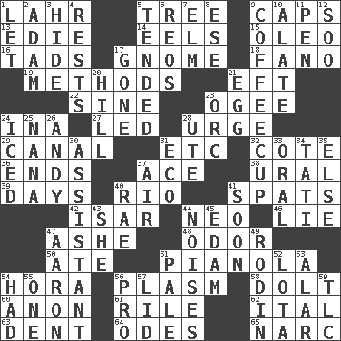 ACROSS 1. Cowardly lion portrayer 5. Relationship diagram 9. Balmoral and tarboosh 13. Singer Brickell 14. Snakelike fish 15. Butter sub 16. Small boys 17. Dwarf 18. Papal veil 19. Modes 21. Lizard (obsolete) 22. Trig term 23. Double curve, resembling the letter S 24. _ tizzy (2 wds.) 27. Directed 28. Goad 29. Lessep's creation 31. And so on (abbr.) 32. ____ d'Azur (French Riviera) 36. Conclusions 37. Adept person 38. Mountain range 39. 24-hour periods 40. _ de Janeiro 41. Arguments over trivial matters 42. Austrian river, tributary to the Danube 44. Modern: prefix 46. Falsehood 47. American tennis player Robert 48. Aroma 50. Had dinner 51. Player piano 54. Israeli folk dance 56. Suffix with ecto or cyto 58. Dunce 60. At once, immediately (arch.) 61. Cause heat under the collar 62. Slanted text style (abbr.) 63. Incision 64. Lyric poems 65. Drug cop DOWN 1. Allow 2. First of billions? 3. Flintstone garb 4. Musical pauses 5. Looked after 6. Vintage cars 7. Shade tree 8. Compass dir. 9. Java holder (2 wds.) 10. Having winglike extensions 11. Writing instrument 12. "Barney Miller" actor Jack 17. Went 20. Land elevation 21. Oval reproductive body of a fowl 23. The grampus (Milton) 24. On the rocks 25. Grandmother 26. "60 Minutes" Commentator Rooney 28. Shoshoni 30. Aide 31. Environmental prefix 33. Relating to the mouth 34. Jacques of French films 35. Otherwise 37. Atmosphere 40. Actress Charlotte 41. Within a short period 43. A female animal or person 44. Annoying sounds 45. Dutch treat 47. Composer Copland 49. "The Thinker" sculptor 51. Diluted with white 52. Globular water bottle used in Asia 53. Having or resembling wings 54. Possessed 55. Single 56. Adept person 57. Flaplike covering 59. Affectionate concern, for short