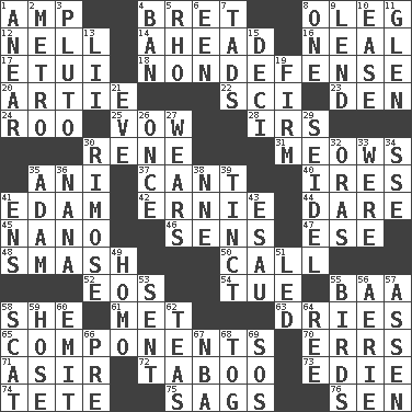 ACROSS 1. Electrical Unit 4. Cy Young winner Saberhagen 8. Cassini of fashion 12. 1994 drama film starring Jodie Foster 14. At or in the front 16. Be tempered by heat 17. Needle case 18. Unrelated to defense, as in spending 20. Nick name for Arthur 22. _-fi 23. Lair 24. Friend of Pooh 25. Promise 28. Big collection agency 30. French philosopher Descartes 31. Catcalls? 35. Black tropical American cuckoo 37. Patter 40. Angers 41. Dutch treat 42. Bert's buddy 44. Have the gumption 45. Billionth: prefix 46. Elected reps. 47. Compass dir. 48. Box-office sellout 50. Give a ring to 52. Greek goddess of the dawn 54. Third day of the wk. 55. Sound made by sheep 58. A female animal or person 61. Was introduced to 63. Frees from moisture 65. Parts 70. Blunders 71. SW Saudi Arabia district 72. Off limits 73. Singer Brickell 74. Wig 75. Settles 76. Elected rep. DOWN 1. Approach 2. Paris' subway 3. Mickey's pet 4. Prohibit 5. 17th letter of the Greek alphabet 6. Car or cant ending 7. Bits 8. Single 9. Grant temporary use of 10. Comfort 11. Small, secluded valley 13. Cards in a Roman deck? 15. Tenth: prefix 19. Securely fixed in place 21. First lady 26. Single time 27. Puts on (as clothing) 29. Beer mug 30. Full of chinks, cracks, or crevices 32. Mouths or openings 33. We are 34. Compass dir. 35. First of billions? 36. Grandmother 38. Compass dir. 39. Tinged 41. Followers of ems 43. Son of Isaac 49. Like (prefix) 51. Directed 53. Posted 55. Avian creatures 56. Nest on high 57. NE Netherlands city 58. Jazz singing style 59. Flexible conduit 60. Send forth 62. Beverages made from leaves 64. Portuguese money of account (variant) 66. Before (prefix) 67. Basketball assoc. 68. Coat; cloak 69. Distress signal