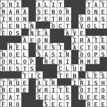 ACROSS 1. _ Lanka 4. Came down and settled, as after flight 8. Make lace 11. Hindu Mythology: god of death 13. Sir (Sp.) 15. Single 16. Picture 17. Stone: prefix 18. Mouths or openings 19. Soviet premier 1918-24 21. Sep. follower 22. Electrical Unit 23. Begley and Asner 24. Teachers' org. 27. "___ Maria" 29. Period of immesurable duration 30. Feeling or showing extreme anger 34. Cartoonist voice _ Blanc 36. A home for chicks 39. Gambison 40. Christmas carol 41. Indian antelope 43. I made a mistake 44. Fourth or lowest deck 46. Painter Guido (1575-1642) 47. Madame (abbr.) 48. Musical pauses 49. A slight indication 51. Nervous spasm 53. Nine, plus one 54. French article 57. Loyal 60. Atmosphere 63. From or relating to Ireland 65. French philosopher Descartes 66. Compose 69. "Beetle Bailey" pooch 70. Consume 71. Makes a sale 72. Fermented drink made from hops 73. Back 74. Religious group 75. Portuguese money of account (variant) DOWN 1. Grin 2. Moved through 3. Removes the wrinkles 4. Cleo's killer 5. Area sheltered from the wind 6. To the inside or interior of 7. Torque (variant) 8. "Corrida" creature 9. Of or related to the anus 10. Trial 12. Cuckoo 14. Round or rotation of duties 18. Conquer 20. Compass dir. 25. Immeasurably long periods of time 26. Approach 28. By way of 29. One to whom something is allotted 31. Smallest unit of an element 32. Drink excessively 33. Followers of ems 34. Greater amount 35. Snakelike fish 37. Compass dir. 38. A color or tint 40. And not 42. The longest river in the world 45. Air pressure measure (abbr.) 50. Single; one (prefix) 52. Crow sounds 54. 61 cubic inches 55. First name in cosmetics 56. Dinah or Pauly 57. Unclean, religiously 58. Bring up, as a child 59. To (old English) 61. Angers 62. Cause heat under the collar 64. Director Reiner 67. Affectionate concern, for short 68. Eastern Standard Time (abbr.)