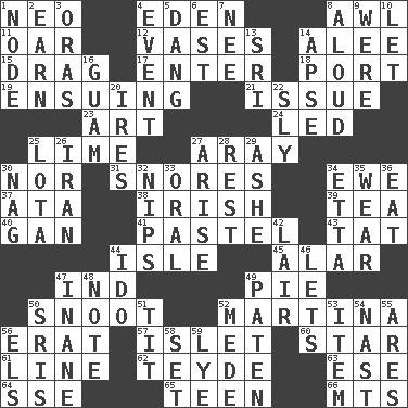 ACROSS 1. Modern: prefix 4. Locale of original sin 8. Leather borer 11. Rowing implement 12. Flower holders 14. Toward shelter 15. To trail on the ground 17. Keyboard key 18. Left side of a ship or aircraft 19. Taking place subsequently 21. Come out of 23. Nonscientific branch of learning 24. Directed 25. Citrus frut 27. Like ___ of sunshine 30. Not either 31. Sounds asleep 34. She-sheep 37. "One Day ___ Time" 38. From or relating to Ireland 39. Beverage made from leaves 40. Separate the seeds from cotton 41. Soft color 43. Make lace 44. Small island 45. Having or resembling wings 47. Indiana (abbr.) 49. Sliced dessert 50. Snob 52. Chrissie's court nemesis 56. Part of Q.E.F. 57. Small island 60. Play the lead 61. Actor's bit 62. Miss Universe 1986, Barbara Palacios _ 63. Compass dir. 64. Compass dir. 65. Adolescent 66. Mountains (abbr.) DOWN 1. Thickened enlargement 2. Merit 3. Mouths or openings 4. Incident 5. Mild oath, euphamism for damn 6. Eastern Standard Time (abbr.) 7. Born 8. Verbally 9. We are 10. Allow 13. Indian title of respect (Mr.) 14. Domed church section 16. Island territory of the United States 20. Angers 22. Roguish 25. Globular water bottle used in Asia 26. SW Asia republic 27. Ascend 28. Remainder 29. American tennis player Robert 30. Tired old horse 32. Cuts off 33. Spoken 34. Singer James 35. Erode 36. Erode 42. Den 44. Wedding promise 46. Allows 47. Silly 48. Short letter 49. Eucharist need 50. Indian titles of respect 51. Teat (slang) 52. Ancient Persian 53. Detail 54. Political cartoonist Thomas 55. Ancient Greek god of war 56. Raised railways 58. Put into a specified state 59. Sodium hydroxide