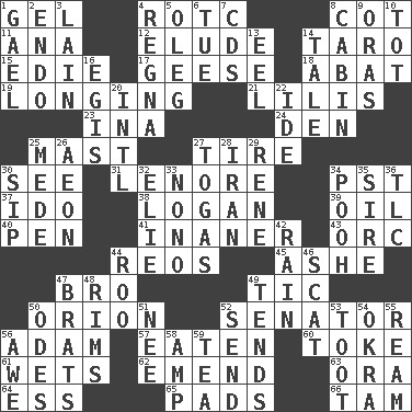 ACROSS 1. Set 4. College mil. group 8. Small bed 11. Santa ___, CA 12. Evade 14. Pacific island yam 15. Singer Brickell 17. Honkers 18. Blind as ____ 19. Yearning 21. Ms. Damita and namesakes 23. _ tizzy (2 wds.) 24. Lair 25. Vertical spar for supporting sails 27. Become fatigued 30. Observe 31. Poe poem 34. Pacific Standard Time (abbr.) 37. Wedding promise 38. Utah city north of Ogden 39. Petroleum 40. Fenced enclosure 41. More empty; more void 43. The grampus (Milton) 44. Vintage cars 45. American tennis player Robert 47. Sis' sibling 49. Nervous spasm 50. Constellation of myth 52. Elected representative 56. First man 57. Consumed 60. Casino tip 61. Soaks 62. Make improvements or corrections to 63. Mouth or opening 64. Curvy letter 65. Writing tablets 66. Scottish cap DOWN 1. Highlander 2. Inside; within (prefix) 3. (Had) reclined 4. Rain (Swedish) 5. Cassini of fashion 6. Third day of the wk. 7. Music discs 8. Small house or cottage 9. Mouths or openings 10. Small child 13. Snakelike fish 14. Story 16. The front part of a cuirass 20. International (abbr.) 22. Binary compound 25. Ancient Persian 26. Period of immesurable duration 27. Ancient Roman robes 28. SW Asia republic 29. French philosopher Descartes 30. Small drink 32. Writer Wiesel 33. Words to Nanette 34. "Silly old bear" 35. The founder of a family 36. Affectionate concern, for short 42. Precipitation 44. Friend of Pooh 46. Get outta here! 47. Naughty children 48. Basketball hoops 49. Is inclined (to) 50. Lyric poems 51. Born 52. Transmit 53. A blast of a horn 54. Gumbo ingredient 55. 480, 500 or 516 sheets of paper 56. Deep reverence 58. Electrical Unit 59. Afternoon social gathering