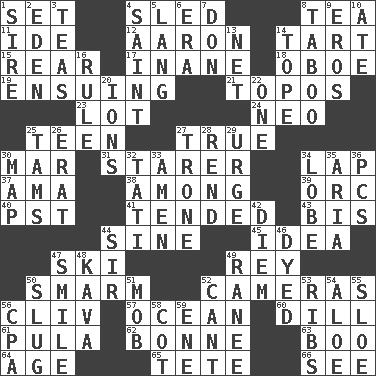ACROSS 1. Arrange properly for use 4. Downhill vehicle 8. Beverage made from leaves 11. Binary compound 12. Composer Copland 14. Small pie 15. Located in or toward the back 17. Lacking in sense or substance 18. Mitch Miller's instrument 19. Taking place subsequently 21. Literary convention 23. Car dealer's back yard 24. Modern: prefix 25. Adolescent 27. Loyal 30. Impair 31. A viewer who gazes fixedly 34. Infant locale 37. Housemaid (var.) 38. Amid 39. The grampus (Milton) 40. Pacific Standard Time (abbr.) 41. Looked after 43. Altar cloth linen 44. Trig term 45. The main thing one is thinking about 47. What Jean-Claude Killy likes to do 49. Marina Del _, California 50. Excessive but superficial compliments 52. Devices for capturing images 56. 154 in Roman numerals 57. Sea 60. Deli pickle 61. Monetary unit of Botswana 62. Maid-servant 63. Surprise greeting 64. Ripen 65. False hair 66. Observe DOWN 1. Male parent of an animal 2. Paradise 3. Beverages made from leaves 4. Inhabitant of Heaven 5. Austrian-born American filmmaker Fritz 6. Epoch 7. Spanish title 8. Off limits 9. Greek god of love 10. Had dinner 13. Fish or hair follower 14. Drink excessively 16. Governing power 20. Charged atoms 22. Single 25. Scottish caps 26. Part of Q.E.F. 27. Marketplace scale 28. Tear apart 29. Goad 30. Atlas unit 32. Jacques of French films 33. So be it 34. Ear part 35. Roberta Peters solo 36. Personal Computers (abbr.) 42. South Vietnam president (1954) 44. Title for a knight 46. Colored 47. Grin 48. Polynesian shrub of the pepper family 49. The wife of a rajah (variant) 50. A hard, heavy blow 51. Disorderly crowd 52. Patter 53. Teases 54. Medicinal plant 55. _ gin 56. Tax preparer (abbr.) 58. Small bed 59. Compass dir.