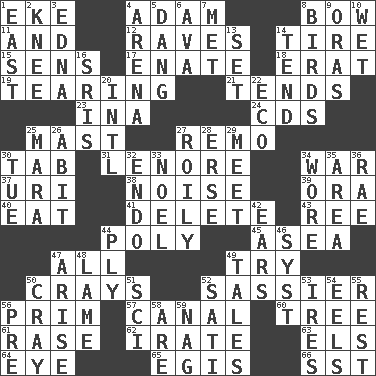 ACROSS 1. Make supply last 4. First man 8. Ribbon knot 11. Also 12. All-night dance parties 14. Hoop that covers a wheel 15. Elected reps. 17. Maternal 18. Part of Q.E.F. 19. Rending 21. Looks after 23. _ tizzy (2 wds.) 24. Music discs 25. Vertical spar for supporting sails 27. San ____ (Riviera town) 30. Keyboard key 31. Poe poem 34. Armed conflict 37. RI univ. 38. Annoying sound 39. Mouth or opening 40. Consume 41. Erase 43. To riddle 44. More than one (prefix) 45. Toward the sea 47. 100% 49. Attempt 50. Trading vessels 52. More lively and spirited 56. Demure 57. Lessep's creation 60. Relationship diagram 61. Raze (variant) 62. Feeling or showing extreme anger 63. Raised railways 64. Sight organ 65. Armor plate that protects the chest 66. Fast jet (abbr.) DOWN 1. Compass direction 2. Leg joint 3. Pulitzer Prize-winning author Ferber 4. Sports stadium 5. Mild oath, euphamism for damn 6. Actress Gardner 7. Was introduced to 8. Avian creatures 9. Mouths or openings 10. Soggy 13. Arrange properly for use 14. Look after 16. Indian titles of respect 20. International (abbr.) 22. Environmental prefix 25. Hindu Mythology: god of death 26. "This won't hurt ____!" 27. Agitated, as a liquid 28. Celtic language 29. Confront 30. Third day of the wk. 32. Inside; within (prefix) 33. Christmas carol 34. Had on 35. Length times width 36. Actress Charlotte 42. Hearing organs 44. Travel a route regularly 46. System (abbr.) 47. Ascend 48. Unable to walk 49. Stories 50. Supercomputer manufacturer 51. _-fi 52. Suttee (variant) 53. Angers 54. Snakelike fish 55. Respite 56. Before (prefix) 58. "We ___ not amused" (Victoria) 59. Tired old horse