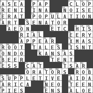 ACROSS 1. At sea 5. Infant food 8. Hoof sound 12. Painter Guido (1575-1642) 13. _ tizzy (2 wds.) 14. Annoying sound 15. Part of Q.E.F. 16. Census information 19. Tate display 20. Elected representative 21. Age 23. And so on (abbr.) 24. Part of HMS, perhaps 27. Monetary unit of Yemen 30. Suggestive of the supernatural 31. Become visible 34. Dec. holiday 35. Carrot, for example 38. Lies 40. Is not 41. Southwest Nigerian state 42. Sunflower state 44. Fermented drink made from hops 45. Portable shelter 46. Curvy letter 47. Domesticated feline 50. Russian ruler of old 53. Speakers 57. Director Reiner 59. Supplying deficiencies 63. Opera by Verdi 64. N. Chile seaport 65. Modern: prefix 66. Adolescent 67. Sliced desserts 68. Followers of ems 69. Medicinal plant DOWN 1. Type of rug 2. Father Junipero _ 3. Related on the mother's side 4. Small island 5. Corncob 6. At once, immediately (arch.) 7. Dad 8. Small bed 9. Cards in a Roman deck? 10. Bear (Spanish) 11. Writing instrument 14. Drug cop 17. Shoshoni 18. Car dealer's back yard 20. Sever or remove by pinching or nipping 22. Speaker 24. Is hesitant and indecisive 25. SW Asia republic 26. System (abbr.) 28. Fitting 29. Path through which fluid escapes 30. Is extant 32. In the manner of 33. Monthly bill 35. Loose flowing garment 36. Singles 37. Lyric poems 39. Compass dir. 43. Pismires 47. Root beer relative 48. "We ___ not amused" (Victoria) 49. Make lace 51. Satellite of Uranus 52. Cowboy competition 54. Prong on a fork 55. Baking chamber 56. Vintage cars 58. Object of repulsion 59. Plant excrement 60. RI univ. 61. Sliced dessert 62. Personal Computers (abbr.) 63. _ moment's notice (2 wds.)