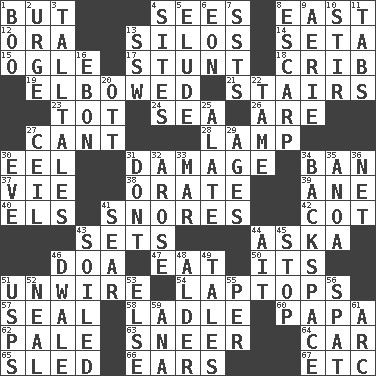 ACROSS 1. With the exception that 4. Observes 8. Compass direction 12. Mouth or opening 13. Grain storage towers 14. Stalk of a moss capsule 15. Stare at amorously 17. Difficult or unusual or dangerous feat 18. Baby bed with high sides 19. Turned at an angle; bent 21. Flight of steps 23. Small child 24. Ocean 26. "We ___ not amused" (Victoria) 27. Patter 28. Desk light 30. Snakelike fish 31. Break 34. Forbid 37. Compete 38. Declaim 39. One (Scot) 40. Raised railways 41. Sounds asleep 42. Small bed 43. Arranges properly for use 44. "____ silly question..." 46. ___ good deed 47. Consume 50. ___ a Wonderful Life 51. Undo the wiring of 54. Portable computers 57. Lick closed 58. Dipping utensil 60. Dad 62. Diluted with white 63. Contemptuous expression 64. Auto 65. Downhill vehicle 66. Hearing organs 67. And so on (abbr.) DOWN 1. Oct. 31 cry 2. Goad 3. Baron Munchausen's specialties 4. Settings 5. Dodge 6. Age 7. Fast planes 8. Fortification 9. Nest on high 10. Disorderly outburst 11. Bar bills 13. Compass dir. 16. Inky black, to poets 20. Baseball player Mel 22. Docile 25. Having winglike extensions 27. To provide with a ceiling 29. Matures 30. First lady 31. Do not 32. Came up 33. Make imperfect 34. Keyboard key 35. Small Philippine buffalo 36. Remaining after all deductions 41. Wither 43. Dirtied 44. Small island 45. Close up, plug up 46. A sleeping potion; an opiate (poet.) 48. Tree or shrub in the Birch family 49. Stories 51. United States Postal Service (abbr.) 52. Anneal 53. Otherwise 55. For each 56. Petty quarrel 59. Santa ___, CA 61. Curve