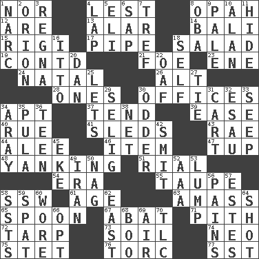ACROSS 1. Or not 4. For fear that 8. Brightly colored fish 12. "We ___ not amused" (Victoria) 13. Having or resembling wings 14. Indonesian resort city 15. Swiss mountan, "Queen of the Mountains" 17. Corncob 18. Vegetable dish 19. Continued (abbr.) 21. Enemy 23. Compass dir. 24. Relating to or accompanying birth 26. The first octave above the treble staff 28. Washington bills 30. Positions of authority 34. Fitting 37. Watch over 39. Relaxation 40. Sorrow 41. Bobsleighs 43. Actress Charlotte 44. Toward shelter 46. A whole individual unit 47. Uncastrated adult male sheep 48. Pulling suddenly and vigorously 51. Monetary unit of Yemen 54. Period 55. Grayish beige 58. Compass dir. 61. Personal question 63. Collect or gather 65. Soup utensil 67. Blind as ____ 71. Essential or central part 72. Canvas cover 73. The visible part of the earth's surface 74. Modern: prefix 75. Proofreading order 76. Torque (variant) 77. Fast jet (abbr.) DOWN 1. Drug cop 2. Constellation of myth 3. Rain (Swedish) 4. Pet locale 5. Connecticut Ivy Leaguer 6. Plant excrement 7. Unclean, religiously 8. Chief or king in Benin or Nigeria 9. Light colored 10. Actor Alda or Thicke 11. Flintstone garb 16. "Tell ____ the Marines!" 18. Oneself 20. One of the 12 tribes of Israel 22. Clumsy lout 25. Allows 27. Neckwear 29. Former Milwaukee Brewers owner Bud 30. More peculiar 31. Draw slowly or heavily 32. He sold his birthright 33. Ooze 34. Like ___ of sunshine 35. Monetary unit of Botswana 36. Adolescent 38. Remaining after all deductions 42. Stricken, poetically 45. Supplement with great effort 49. SW Asia republic 50. Tired old horse 52. American Automobile Association (abbr.) 53. Mass 56. Aches 57. _____ Park, CO 58. Fast planes 59. Petty quarrel 60. Had on 62. Compass direction 64. Attempt 66. Elect 68. Surprise greeting 69. Wind 70. Affectionate concern, for short