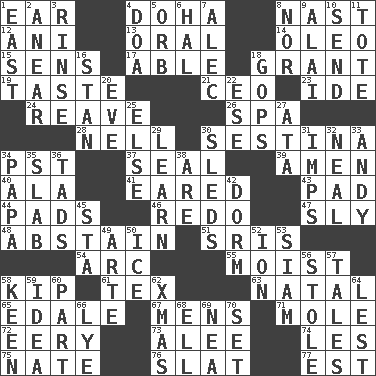 ACROSS 1. Hearing organ 4. Capital of the state of Qatar 8. Political cartoonist Thomas 12. Black tropical American cuckoo 13. Relating to the mouth 14. Margarine 15. Elected reps. 17. Competent 18. Monetary aid 19. Clothes sense 21. Corporate head (abbr.) 23. Binary compound 24. Rob, plunder, or pillage 26. Health resort 28. 1994 drama film starring Jodie Foster 30. French poetic form 34. Pacific Standard Time (abbr.) 37. Lick closed 39. So be it 40. Chicken ___ king 41. Having ears or earlike features 43. Groovy apt. 44. Writing tablets 46. Redecorate 47. Playfully artful 48. Choose not to consume 51. Indian titles of respect 54. Curve 55. Damp 58. Monetary unit of Laos 61. John Ritter's dad 63. Brizilian seaport 65. Peak District village in England 67. Not women's 71. Undercover agent 72. Suggestive of the supernatural 73. Toward shelter 74. French article 75. Nathan's nickname 76. Narrow board 77. Eastern Standard Time (abbr.) DOWN 1. Compass direction 2. Approach 3. Wash lightly 4. ___ good deed 5. Globe 6. Actor Linden 7. Actor Baldwin 8. And not 9. Jai _ 10. Transmit 11. Carry 16. Comedian Laurel of Laurel & Hardy 18. Republicans 20. First lady 22. Compass dir. 25. Otherwise 27. "One Day ___ Time" 29. Memorize 30. Bobsleighs 31. Naughty children 32. Actress Patricia 33. Actor Griffith 34. Dad 35. Broad, flat, thick piece 36. Small amounts or degrees 38. "We ___ not amused" (Victoria) 42. Dormintory (informal) 45. R.R. building 49. Johnson of "Laugh-In" 50. Frozen water 52. Electrically charged atom 53. Thailand, formerly 56. Fur scarf 57. Stories 58. Peachy ____! 59. It may be bright or harebrained 60. Component 62. Dec. holiday 64. For fear that 66. Sodium hydroxide 68. Pipe bend 69. Teachers' org. 70. Put into a specified state