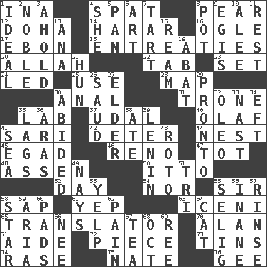 ACROSS 1. _ tizzy (2 wds.) 4. Argument over a trivial matter 8. Lightbulb-shaped fruit 12. Capital of the state of Qatar 14. Ethiopian city, capital of Harari 16. Stare 17. Inky black, to poets 18. Pleas 20. Assad's deity 22. Keyboard key 23. Arrange properly for use 24. Directed 25. Purpose 28. Atlas unit 30. Of or related to the anus 31. Marketplace scale 35. Experiment locale 37. Freehold land 40. Norwegian king 41. Indian skirt 42. Prevent from occurring 44. A home for chicks 45. Mild oath 46. Western Nevada city 47. Small child 48. NE Netherlands city 50. "Tell ____ the Marines!" 52. 24 hours 54. Or not 55. Title for a knight 58. Plant excrement 61. Slangy assent 63. Ancient Celtic tribe of eastern Britain 65. Interpreter 70. Actor Alda or Thicke 71. Assistant 72. Component 73. Canisters 74. Raze (variant) 75. Nathan's nickname 76. Unit of force equal to gravity DOWN 1. Perfect 2. Impressive in appearance 3. Hold, grip (Informal) 4. A female animal or person 5. Baking dish 6. Nonscientific branch of learning 7. Small pie 8. Plant holder 9. Armor plate that protects the chest 10. Toward shelter 11. Relief 13. Santa ___, CA 15. 480, 500 or 516 sheets of paper 19. Blind as ____ 21. Attila the _ 26. Saudi Arabian king (1953-1964) 27. A person who is older than you are 29. Right away 30. Remained 32. Butter sub 33. Political cartoonist Thomas 34. Newt 35. Falls behind 36. Caspian sea tributary 38. Had dinner 39. Soviet premier 1918-24 41. Ocean 43. Printing process, for short 49. Negative votes 51. Three (prefix) 53. Sharp bark 55. Major League Baseball Commissioner Bud 56. Silly 57. Wash lightly 58. Play the lead 59. Roberta Peters solo 60. Writing tablets 62. Ache 64. Domesticated feline 66. Born 67. Afternoon social gathering 68. Sep. follower 69. To sift