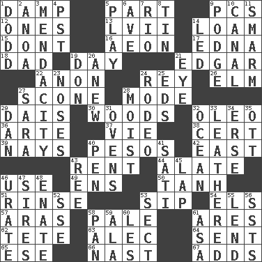ACROSS 1. Moist 5. Component 9. Personal Computers (abbr.) 12. Singles 13. 57 in ancient Rome 14. Rich soil 15. Do not 16. Period of immesurable duration 17. Pulitzer Prize-winning author Ferber 18. June honoree 19. 24 hours 21. _ Allan Poe 22. At once, immediately (arch.) 24. Marina Del _, California 26. Shade tree 27. Biscuitlike quick bread 28. Method 29. Raised platform 30. Forest 32. Butter sub 36. Johnson of "Laugh-In" 37. Compete 38. Sure thing 39. Negative votes 40. Mexican monetary units 42. 90 degrees 43. Monthly bill 44. Having winglike extensions 46. Purpose 49. Followers of ems 50. Hyperbolic tangent 51. Remove soap 53. Small drink 54. Raised railways 57. Ancient river in northeast Turkey 58. Light colored 61. Ancient Greek god of war 62. False hair 63. Actor Baldwin 64. Emitted 65. Compass dir. 66. Political cartoonist Thomas 67. Does sums DOWN 1. Texas town _ City 2. Small Philippine buffalo 3. Ananias' fault 4. Pacific Standard Time (abbr.) 5. Frolic 6. "___ Maria" 7. _ de Janeiro 8. Metal container 9. Porridge 10. Lessep's creation 11. Excessive but superficial compliments 14. Directed 19. Spanish title 20. Afresh 21. Sight organ 23. Olfactory organs 24. Cowboy competition 25. Begley and Asner 27. "Two Mules for Sister ____" 28. Wet 29. One of the 12 tribes of Israel 31. Baking chambers 32. Sea 33. Tough but pliablecoriaceous 34. Celtic language 35. Baseball player Mel 40. Fenced enclosure 41. Suttee (variant) 43. To riddle 45. Infant locale 46. A salt of uric acid 47. Founders of families 48. Related on the mother's side 52. Compass dir. 53. Religious group 55. Grant temporary use of 56. Fast planes 58. Baking dish 59. Wing 60. French article 61. White ___ sheet
