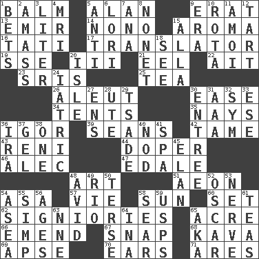 ACROSS 1. Lip ointment 5. ____ Jay Lerner 9. Part of Q.E.F. 13. Independent ruler or chieftain 14. Words to Nanette 15. Odor 16. Jacques of French films 17. Interpreter 19. Compass dir. 20. One more than two 21. Snakelike fish 22. Small island 23. Indian titles of respect 25. Afternoon social gathering 26. Eskimo relative 30. Relaxation 34. Portable shelters 35. Negative votes 36. Composer Stravinsky 39. Seines 42. Not wild 43. Painter Guido (1575-1642) 44. Drug addict 46. Actor Baldwin 47. Peak District village in England 48. Tate display 51. Period of immesurable duration 54. White ___ sheet 57. Compete 58. Player for Phoenix 60. Put into a specified state 62. Seigniories (variant) 65. 43,560 square feet 66. Make improvements or corrections to 67. Fastener 68. Polynesian shrub of the pepper family 69. Domed church section 70. Hearing organs 71. Ancient Greek god of war DOWN 1. Antes 2. Collect or gather 3. 61 cubic inches 4. Medical imaging device (abbr.) 5. Opposed to 6. Australian parrot (variant) 7. Santa ___, CA 8. Music written for nine 9. Period 10. Roll call or roster of names 11. Mine, in Marseilles 12. Small pie 15. Silent film actress Nazimova 18. Observe 20. Small island 24. Of or pertaining to medicine 27. Followers of ems 28. Shoshoni 29. Sadhe (variant) 30. Main course 31. American Automobile Association (abbr.) 32. Symbol (abbr.) 33. Compass dir. 36. Retirement account (abbr.) 37. Set 38. Single 40. Dreamland 41. Health resort 45. Style 48. Enthusiastic 49. _ de Janeiro 50. Laconic 52. Motion picture award 53. Effrontery 54. At sea 55. Simple or foolish person 56. Eras 58. Wither 59. United States Postal Service (abbr.) 61. Beverages made from leaves 63. Compass dir. 64. _ tizzy (2 wds.) 65. Alias (abbr.)