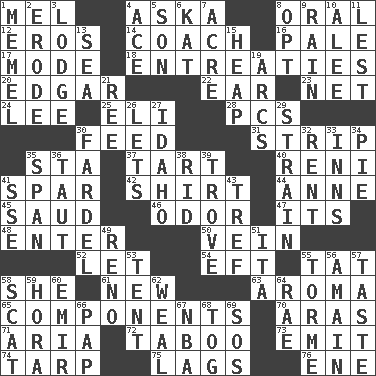 ACROSS 1. Cartoonist voice _ Blanc 4. "____ silly question..." 8. Relating to the mouth 12. Greek god of love 14. Team commander 16. Diluted with white 17. Method 18. Pleas 20. _ Allan Poe 22. Hearing organ 23. Fish or hair follower 24. Area sheltered from the wind 25. Connecticut Ivy Leaguer 28. Personal Computers (abbr.) 30. Nourish 31. Long narrow piece of something 35. R.R. building 37. Small pie 40. Painter Guido (1575-1642) 41. Practice fight 42. Chest covering 44. Singer Murray 45. Saudi Arabian king (1953-1964) 46. Aroma 47. ___ a Wonderful Life 48. Keyboard key 50. Distinctive style or manner 52. Allow 54. Bank Draft (abbr.) 55. Make lace 58. A female animal or person 61. ___ Haven, CT 63. Scent 65. Parts 70. Caspian sea tributary 71. Roberta Peters solo 72. Off limits 73. Give off 74. Canvas cover 75. Straggles 76. Compass dir. DOWN 1. Klaipeda city 2. Wear away 3. Inn 4. Adept person 5. Male offspring 6. Krazy ___ of comics 7. 1/640 square mile 8. Elect 9. Precipitation 10. Toward shelter 11. For fear that 13. Ocean 15. Pile 19. Arches 21. To riddle 26. Allows 27. Potato state 29. Put through a sieve 30. Burden 32. Monthly bill 33. Restaurants 34. Sliced dessert 35. Connect, as a bridge 36. Tense 38. To free from 39. Collection of objects 41. Compass dir. 43. Unclean, religiously 49. Western Nevada city 51. Call ___ day 53. Portable shelter 55. Singer Mel 56. With great haste 57. Clothes sense 58. Scram! 59. Israeli folk dance 60. Independent ruler or chieftain 62. Welt 64. Actress Charlotte 66. Infant food 67. Basketball assoc. 68. Coat; cloak 69. Mayday