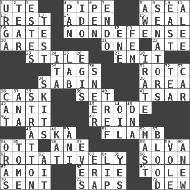 ACROSS 1. Shoshoni 4. Corncob 8. At sea 12. Relief 14. Arabian gulf 15. Welt 16. Yard entry 17. Unrelated to defense, as in spending 20. Ancient Greek god of war 21. Single 22. Had dinner 23. Vertical member of a panel or frame 27. Give off 29. Labels 31. College mil. group 34. Unit of acoustic absorption 35. Length times width 36. Keg 39. Arrange properly for use 41. Russian ruler of old 42. Against 43. Wear away 46. Small pie 47. It's straight from the horse's mouth 48. "____ silly question..." 51. Flambe (short form) 54. Baseball player Mel 56. A saturated hydrocarbon 58. Inventor's middle name 61. Happening in regular succession 66. Within a short period 67. Mine, in Marseilles 68. One of the Great Lakes 69. Lacquered or enameled metalware 70. Emitted 71. Plant excrements 72. Morning condensation DOWN 1. Capital and largest city of Mongolia 2. Pull into pieces 3. _____ Park, CO 4. Baking dish 5. Wedding promise 6. Writing instrument 7. Inside; within (prefix) 8. Deep reverence 9. Legislators 10. 90 degrees 11. Toward shelter 13. Trial 18. Compass dir. 19. Opposite of masc. 24. Call ___ day 25. Experiment locale 26. The front part of a cuirass 28. Feeling or showing extreme anger 30. Scornful expression 32. Beverage made from leaves 33. Automobile 34. Burlesque acts 36. Domesticated feline 37. Santa ___, CA 38. Ski resort town in Vermont 40. Unclean, religiously 44. Lubricate 45. Heredity factor (abbr.) 49. Krazy ___ of comics 50. Black tropical American cuckoo 52. Vertical spar for supporting sails 53. Vital fluid 54. Mouths or openings 55. Heavy book 57. Nights before holidays 59. Grand slam 60. Afresh 62. Small island 63. Epoch 64. Mouth edge 65. Affirmative reply