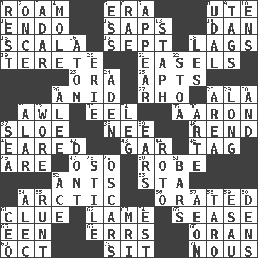 ACROSS 1. Wander 5. Period 8. Shoshoni 11. Inside; within (prefix) 12. Plant excrements 14. Daniel's nick name 15. Any of the three canals of the cochlea 17. Back-to-school mo. 18. Falls behind 19. Cigar-shaped 21. Artist's stands 23. Mouth or opening 25. Flats, for short 26. Among 27. 17th letter of the Greek alphabet 28. Wing 31. Leather borer 33. Snakelike fish 35. Composer Copland 37. _ gin 38. Born 40. Tear apart 41. Having ears or earlike features 43. Slender fish 45. Label 46. "We ___ not amused" (Victoria) 47. Bear (Spanish) 50. Loose flowing garment 52. Pismires 53. R.R. building 54. Northern region 56. Spoke pompously 61. A slight indication 62. Unable to walk 65. Gospel singer Marvin 66. Car or cant ending 67. Blunders 68. Northwest Algerian city 69. Sep. follower 70. Be seated 71. Good sense DOWN 1. Respite 2. At one time in the past 3. The sixth month of the Jewish calendar 4. Undercover agent 5. Curvy letter 6. Actress Charlotte 7. Seem 8. Allodial 9. Labels 10. Followers of ems 13. Staphylococcus 16. Smallest unit of an element 18. French article 20. 4th largest of the Great Lakes 22. Portico 24. An important port of Yemen 26. Toward shelter 28. Length times width 29. Protracted 30. Also 31. Having or resembling wings 32. Had on 34. Part of a journey 36. Johnson of "Laugh-In" 37. Ocean 39. Hearing organs 42. Do not 44. Printing process, for short 48. Vertical member of a panel or frame 49. Motion picture awards 51. Soap units 52. Adept person 54. Actor Baldwin 55. Undersized animal 57. A really long time 58. Edible starchy tuberous root 59. He sold his birthright 60. Hiding places for outlaws 61. Corporate head (abbr.) 63. Medical imaging device (abbr.) 64. Eastern Standard Time (abbr.)