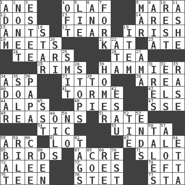 ACROSS 1. A saturated hydrocarbon 4. Norwegian king 8. Hindu Mythology: god of death 12. Two (Sp.) 13. Fine (Spanish) 14. Ancient Greek god of war 15. Pismires 17. Lacerate 18. From or relating to Ireland 19. Confronts 21. Krazy ___ of comics 23. Had dinner 24. Pulls into pieces 26. Beverage made from leaves 28. Basketball hoops 30. More overdramatic by comparison 34. Cleo's killer 37. "Tell ____ the Marines!" 39. Length times width 40. ___ good deed 41. Singer Mel 43. Raised railways 44. High mountains 46. Sliced desserts 47. Compass dir. 48. Thinks logically 51. Pace 54. Nervous spasm 55. National forest in Provo, Utah 58. Curve 61. Car dealer's back yard 63. Peak District village in England 65. Avian creatures 67. 1/640 square mile 71. Slit 72. Toward shelter 73. Leaves 74. Bank Draft (abbr.) 75. Adolescent 76. Proofreading order 77. R.R. building DOWN 1. First man 2. Music written for nine 3. First name in cosmetics 4. Often (poetically) 5. Whopper 6. Santa ___, CA 7. Tined utensil 8. Make imperfect 9. Operatic vocal solo 10. Respite 11. American tennis player Robert 16. Play the lead 18. A distinct part 20. _ Lanka 22. "One Day ___ Time" 25. Stricken, poetically 27. Nanny (var.) 29. Discontinues 30. Simpsons dad 31. Angers 32. Snakelike fish 33. Raze (variant) 34. The sixth month of the Jewish calendar 35. Not divided or shared with others 36. Dad 38. Three (prefix) 42. He sold his birthright 45. Fast jet (abbr.) 49. Lubricates 50. Non-commissioned officer (abbr.) 52. Neckwear 53. Conclusions 56. Stories 57. Upward 58. Blind as ____ 59. Cause heat under the collar 60. Algonquian 62. Labels 64. Singer James 66. Lair 68. Small bed 69. To separate or throw off 70. Eastern Standard Time (abbr.)